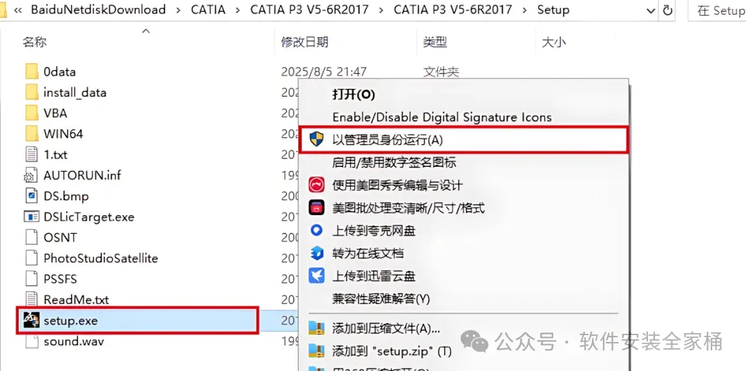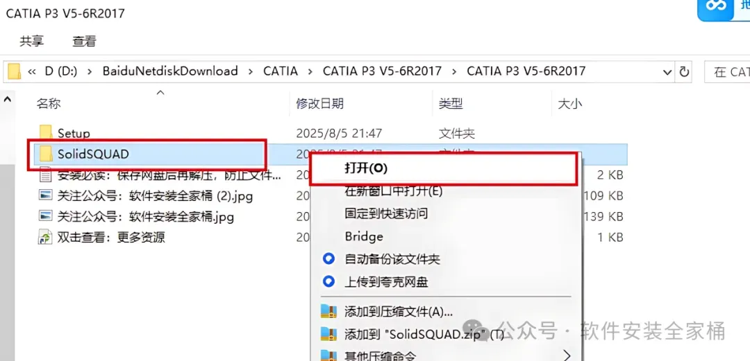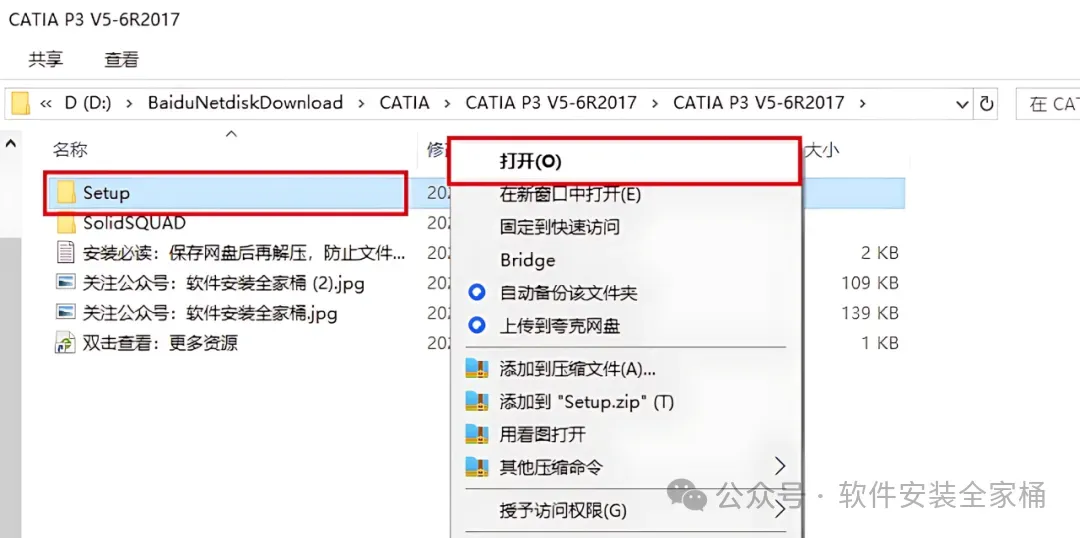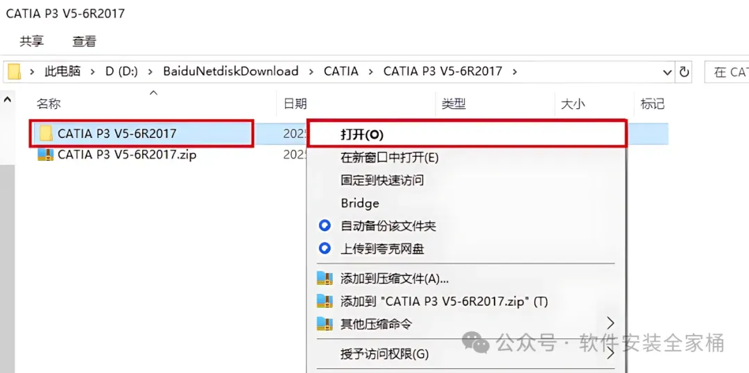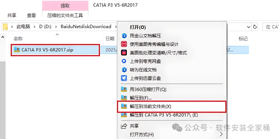 1、下载CATIA P3 V5-6R2017软件安装包到电脑上,右键选择【解压到当前文件夹】