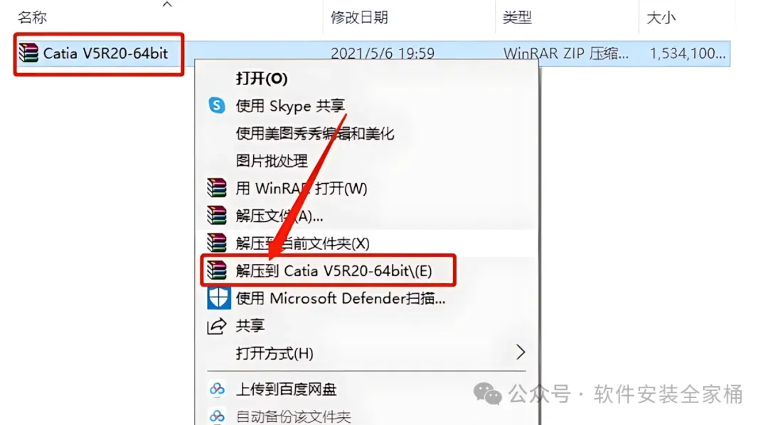 1.打开下载的Catia V5R20软件安装包,鼠标右击压缩包选择【解压到Catia V5R20】。