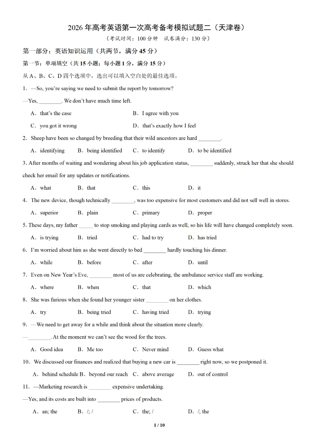【可打印】2026年高考英语第一次高考备考模拟试题二(天津卷)(附解析) 点击上方“蓝字”免费关注! 本套试卷+答案解析下载入口 关注“卿卿侃古今”公众号 点击左下角阅读原文可下载 相关链接: 2007-2025年天津市高考英语真题汇总(持续更新中~) 2011-2023年天津高考英语听力真题在线测试 【高考英语听力在线测试】高考听力机考模拟试题大全(持续更新中) 【可下载】2025-2026年高中英语试题汇总(附解析)【持续更新中】 【汇总】高中英语月考和期中期末试题(持续更新中~) 【题库】高一英语试题汇编(持续更新中~) 【题库】高二英语试题汇编(持续更新中~) 【题库】高三英语试题汇编(持续更新中~) 【可下载】高三英语上学期期末试题16套(附解析) 【可下载】高二英语上学期期末试题10套(附解析) 【可下载】高一英语上学期期末试题汇9套(附解析) 【可下载】2025-2026学年度高一高二高三开学考试模拟试卷(天津专用)(附解析) 新外研版高中英语高清电子课本、课文原文和译文、单元同步复习资料和试题【持续更新中】 【目录1】高中英语阅读理解限时训练大全(持续更新中~) 【目录2】高中英语完形填空限时训练大全(持续更新中~) 【目录3】高中英语书面表达大全(持续更新中~) 【目录4】高中英语听力训练大全(持续更新中~) 【目录5】高中英语单选题大全(持续更新中~) 【目录6】高中英语语法题大全(持续更新中~) 【目录7】高中英语阅读表达题大全(持续更新中~) 【目录8】科普知识汇总 【目录9】中高考学法知识汇总 【目录10】高考英语真题+名校模拟真题+月考和期中期末试题(持续更新中~) 【目录11】暑期高考英语备考资料大全持续更新中~【汇总】中高考志愿填报资料大全 【汇总】高中英语月考和期中期末试题(持续更新中~) 【汇总】2025届高三英语一模试题(附解析) 【汇总】2024届高三英语一模二模三模试题(附解析) 【汇总】2024届高考英语押题卷(附解析) 【汇总】2025届高三英语周考综合练(附解析) 【题库】高三英语限时训练(持续更新中~) 【模拟】2025届高三英语听力机考模拟试题在线测试 【高考词汇】(新)外研版高中英语全七册词汇表(附音频) 【中考词汇】初中英语外研版必备单词表(完整版),可打印 建议收藏保存 点击阅读原文查更多