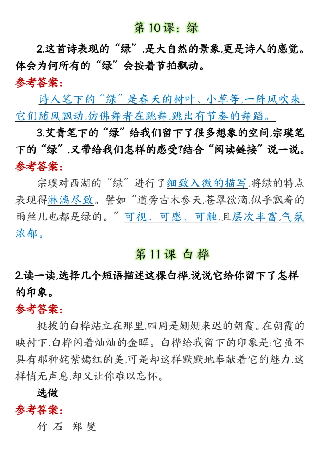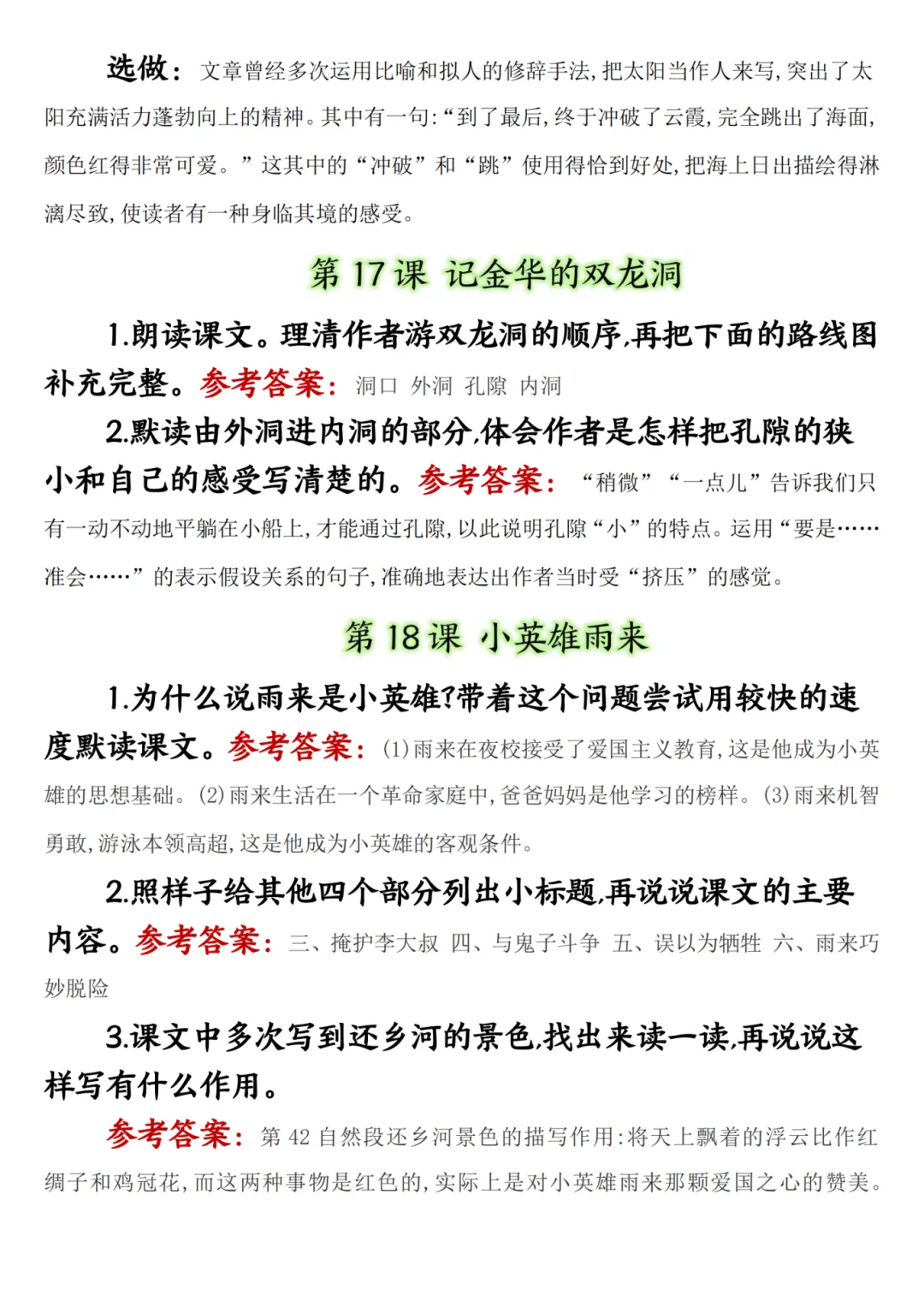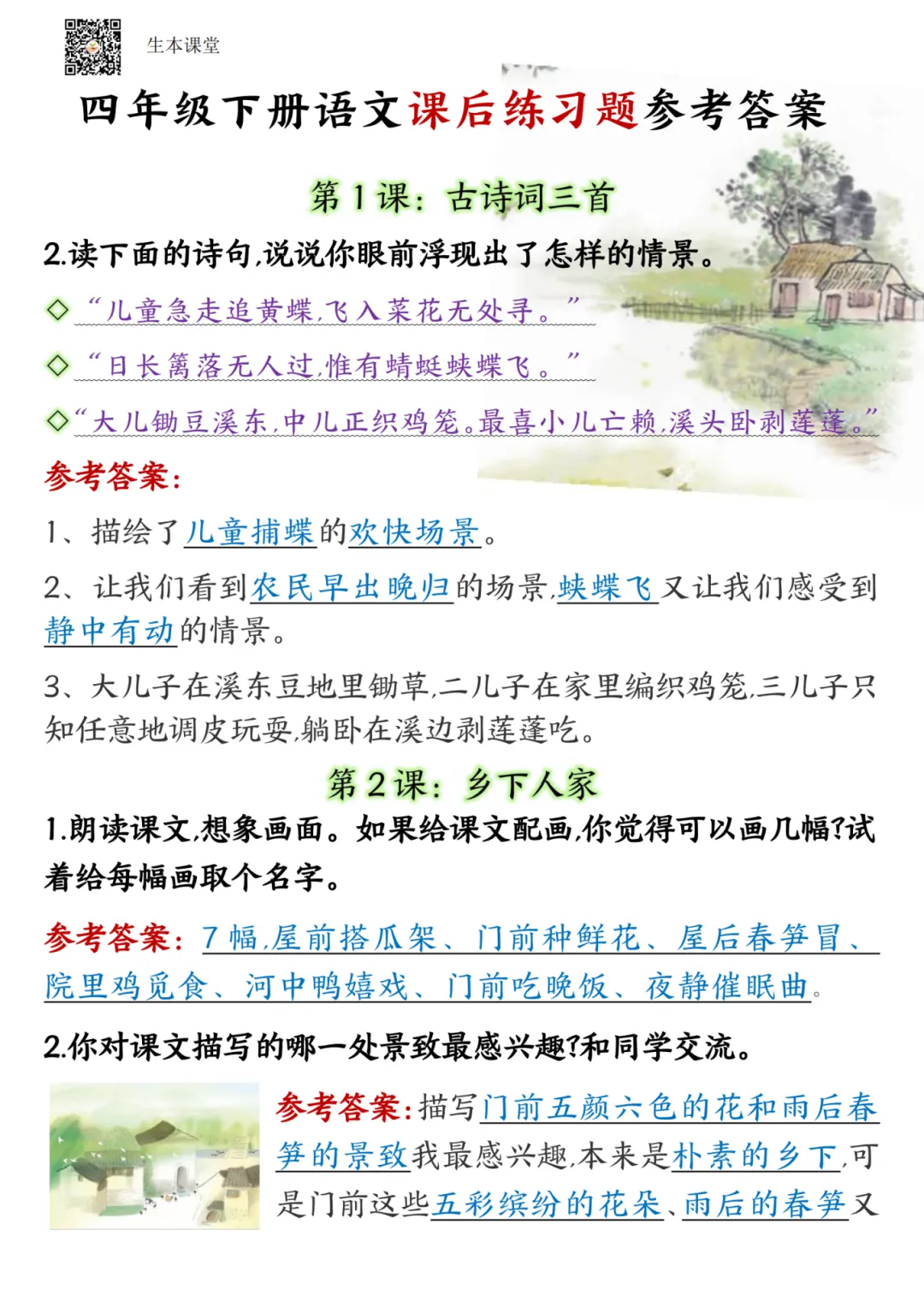 四年级下册语文课后习题答案,电子版,可打印