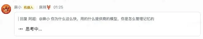 从这张截图可以看到,当有人问“麻小”(另一个 AI 助手)为什么速度这么快、用什么模型、如何管理记忆时,系统显示“思考中……”。