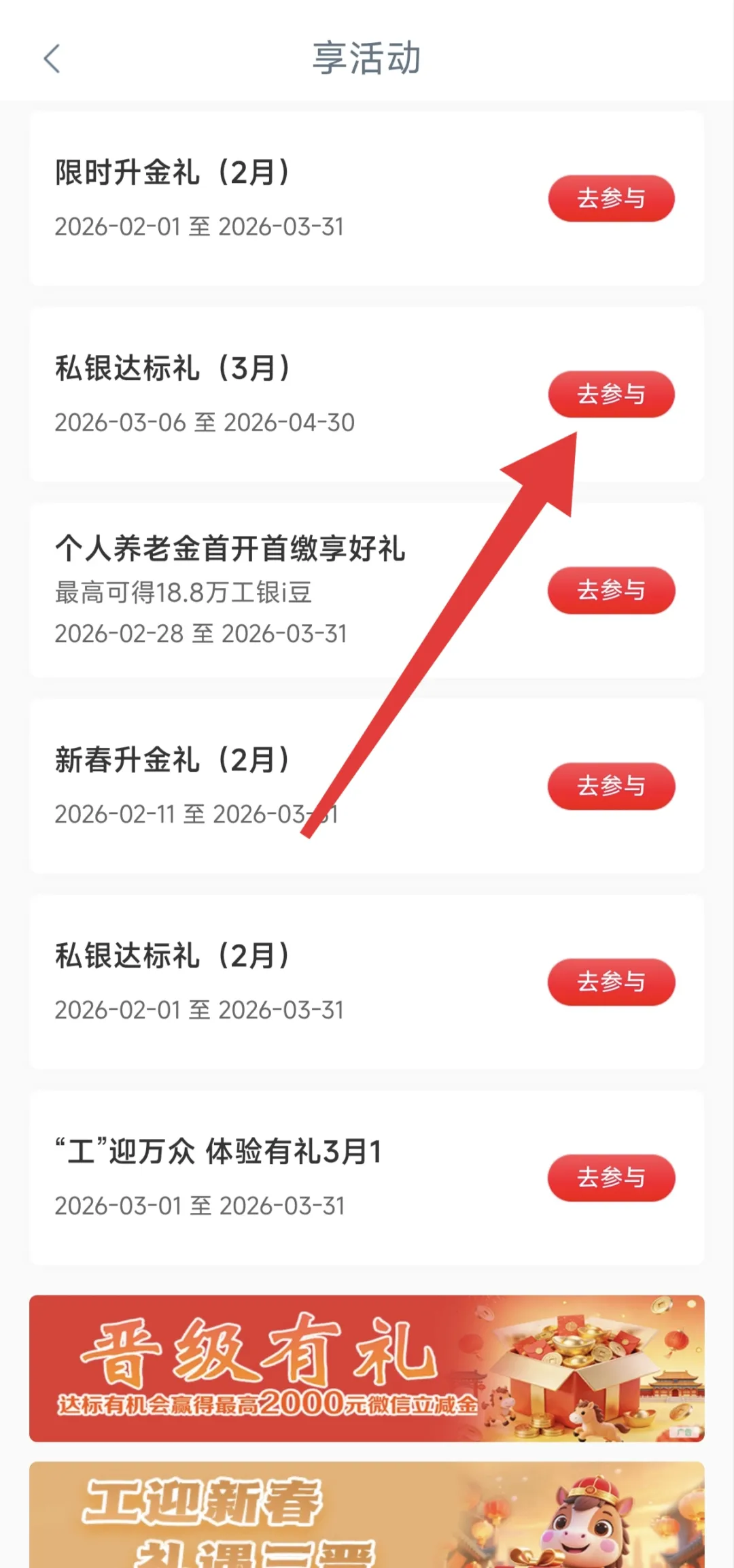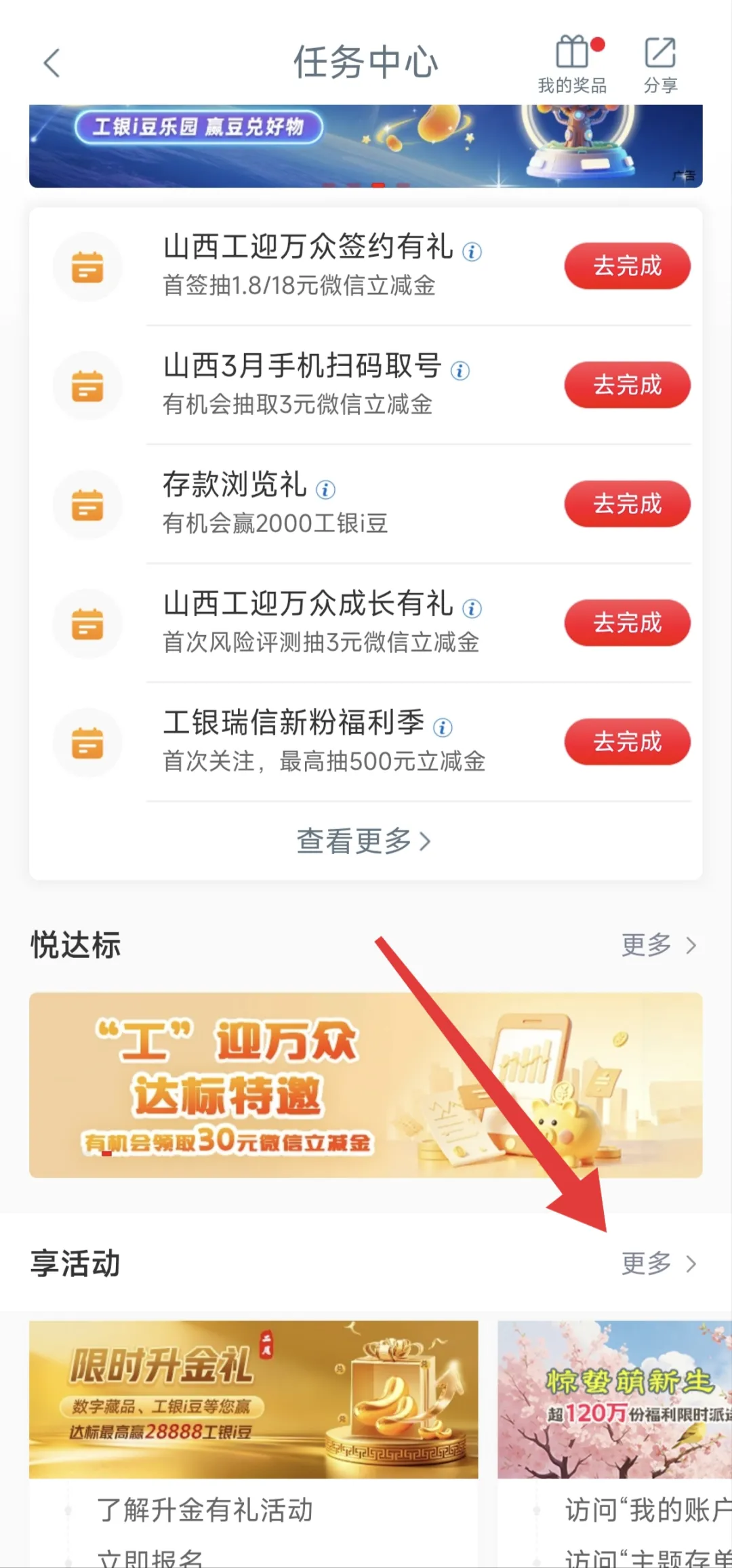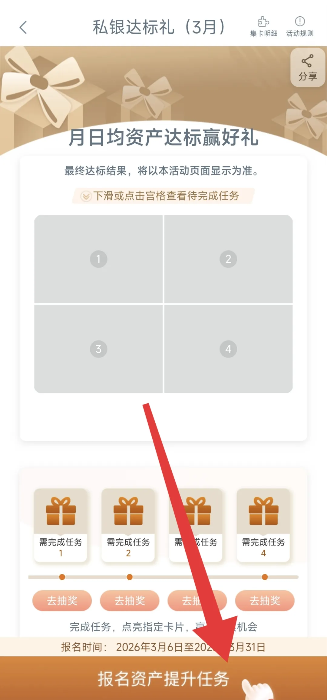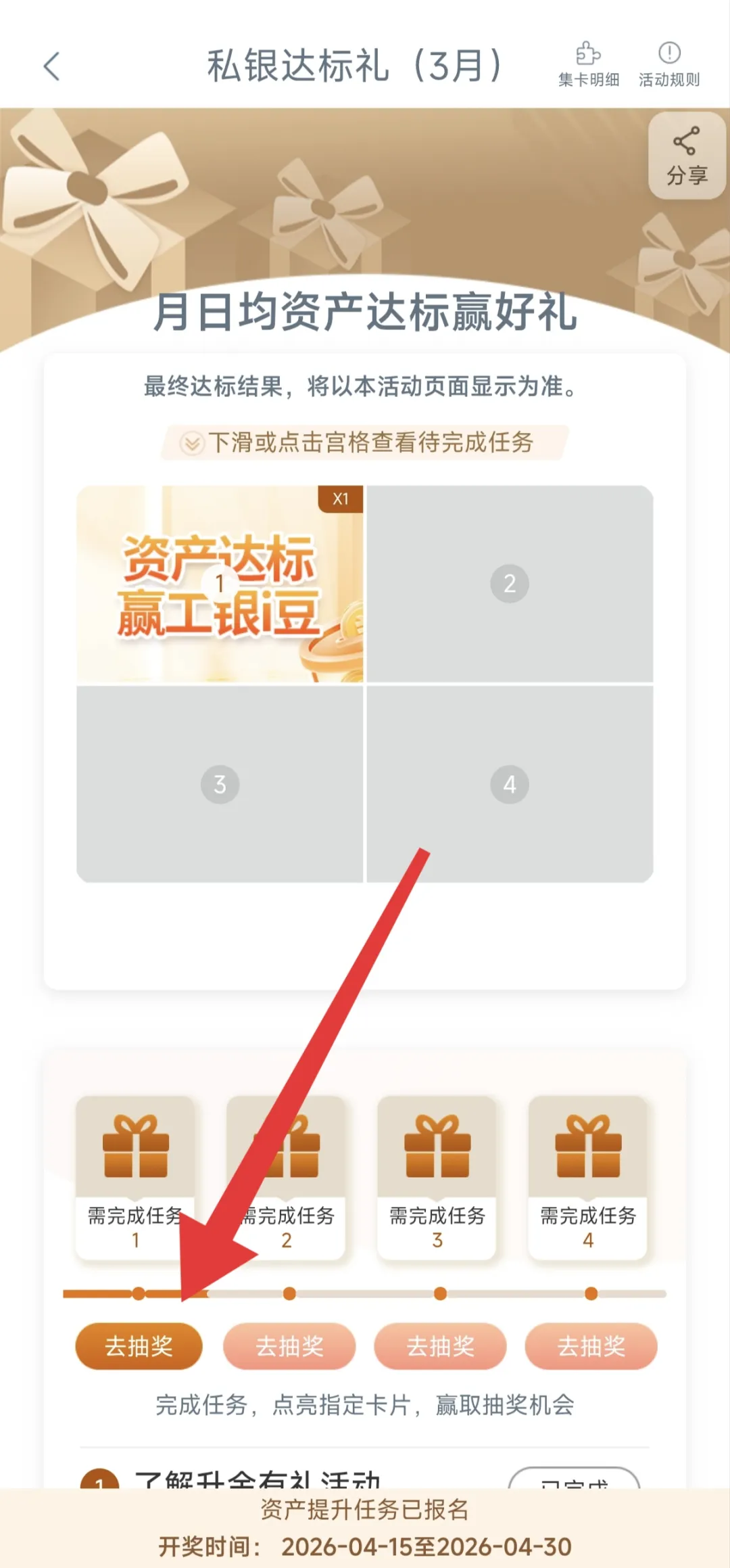 工行APP任务中心→下方享活动→私银达标礼(3月)→点击最下方报名→完成一个浏览任务即可抽奖获得。