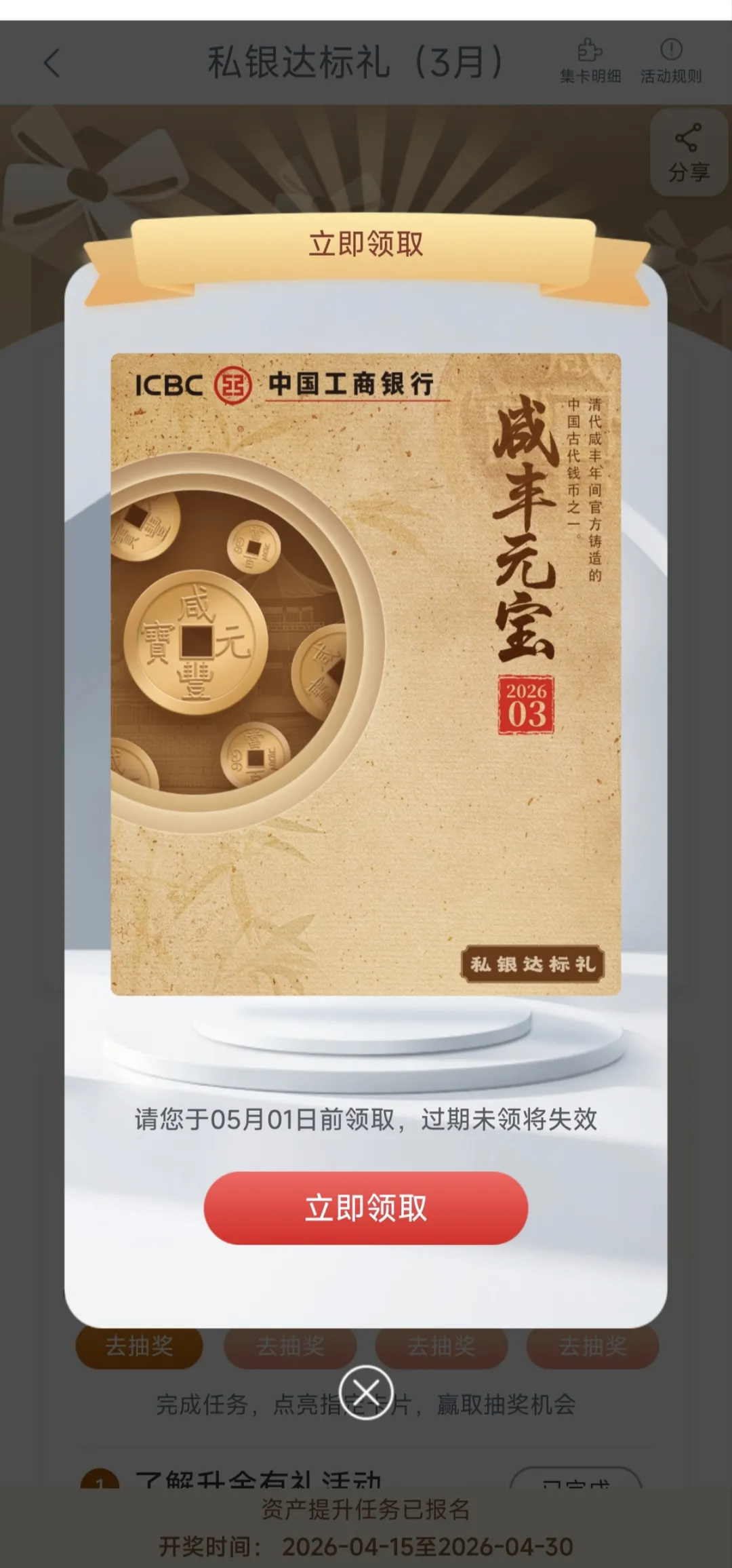 工行APP免费领取3月达标咸丰元宝数字藏品,报名就有!