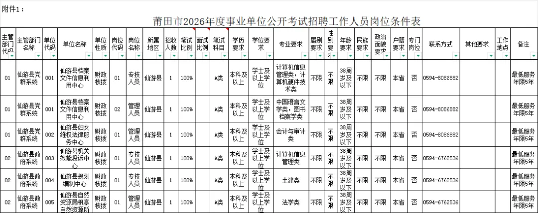Excel下载!福建事业单位联考全省岗位表