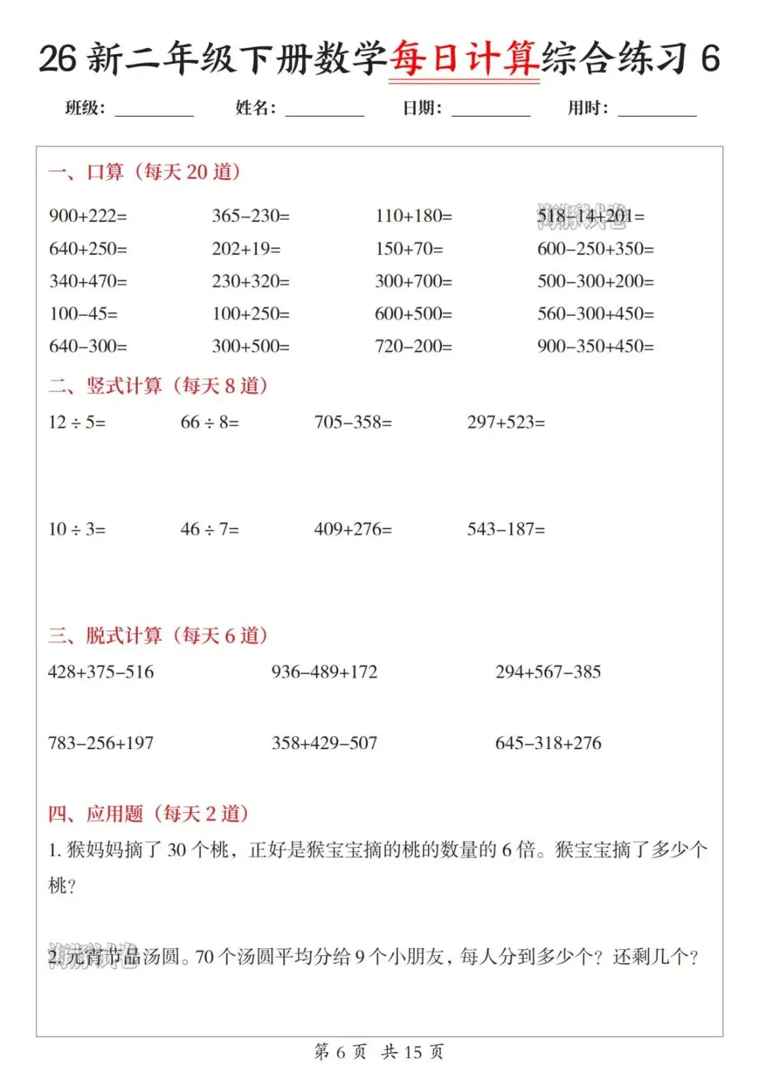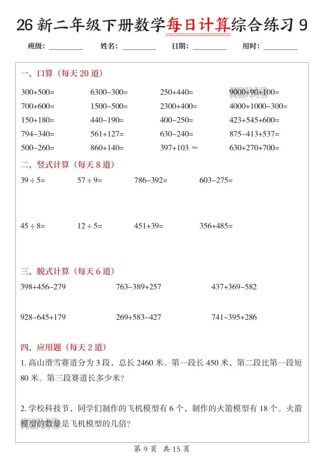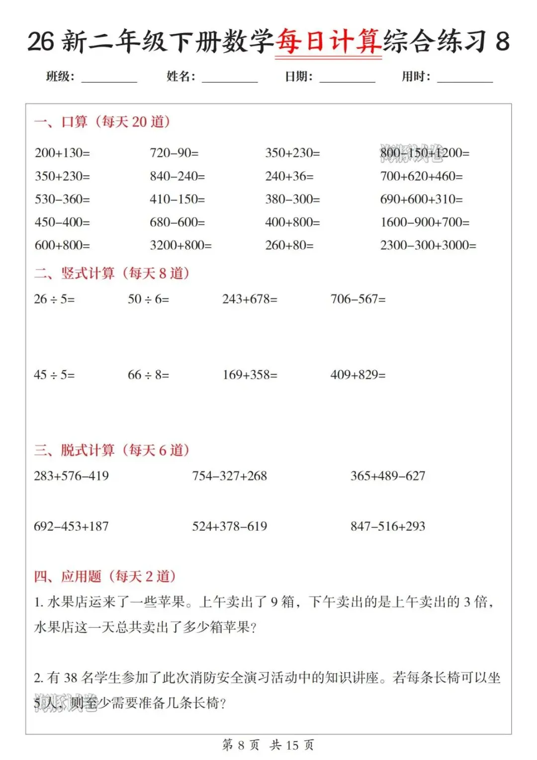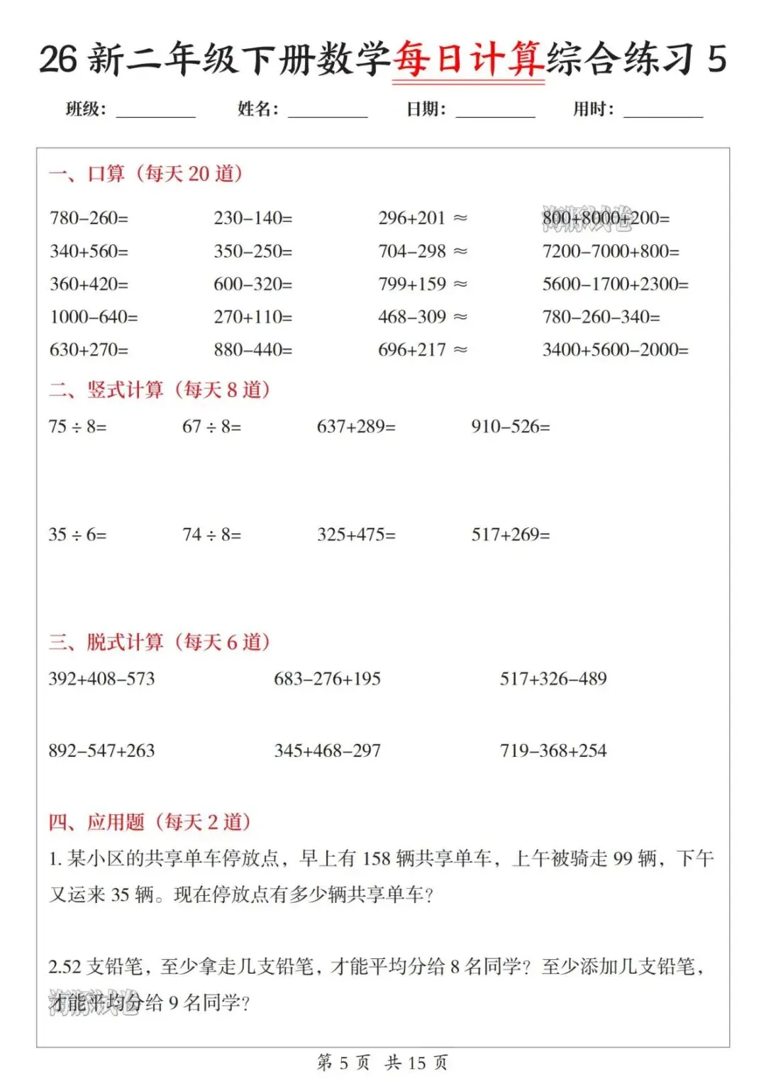 二年级下册数学【每日计算综合练习】,电子版可打印