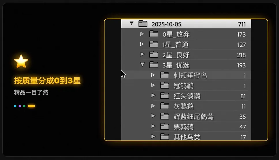 处理完成后,照片会按星级自动分类到对应文件夹: