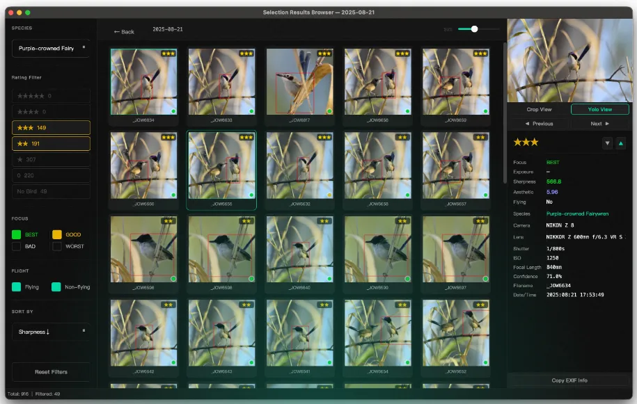 AI 自动评分:从鸟的位置、鸟眼清晰度、画面构图和光影三个维度综合打分,输出 0-3 星评级 -