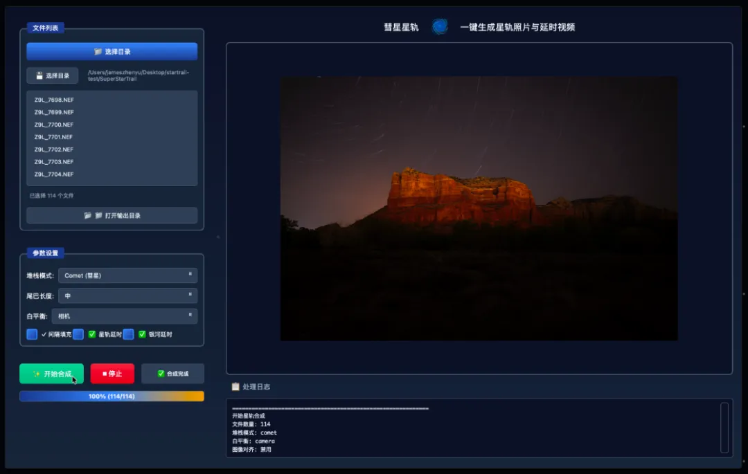 点击 “开始处理” 按钮,软件开始合成星轨 -