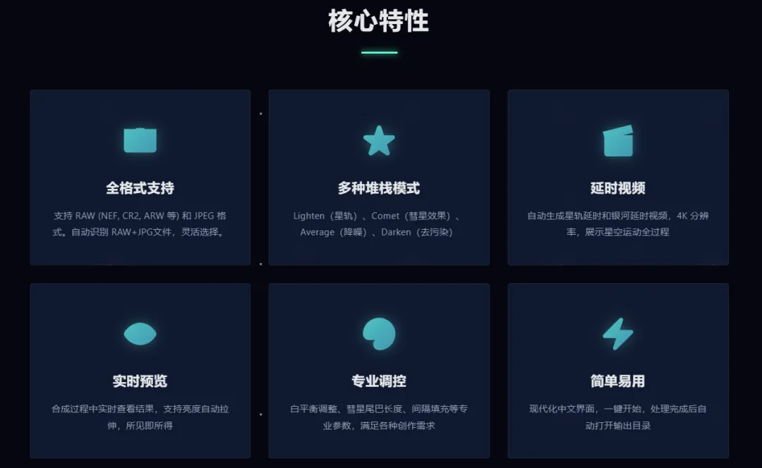 1. 工具定位专为星空摄影设计的星轨照片与星轨 / 银河延时视频生成工具,专注解决从 RAW 文件开始,高质量、可控地完成星轨输出的问题。
