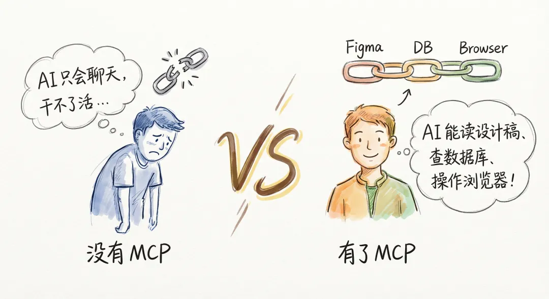 为啥?因为它「看不到你的设计稿、连不上数据库、也没法打开浏览器帮你验证页面」。它就像一个高手被关在小黑屋里,你说啥它都能回答得头头是道,但让它真正动手做事?抱歉,手脚被绑着呢。