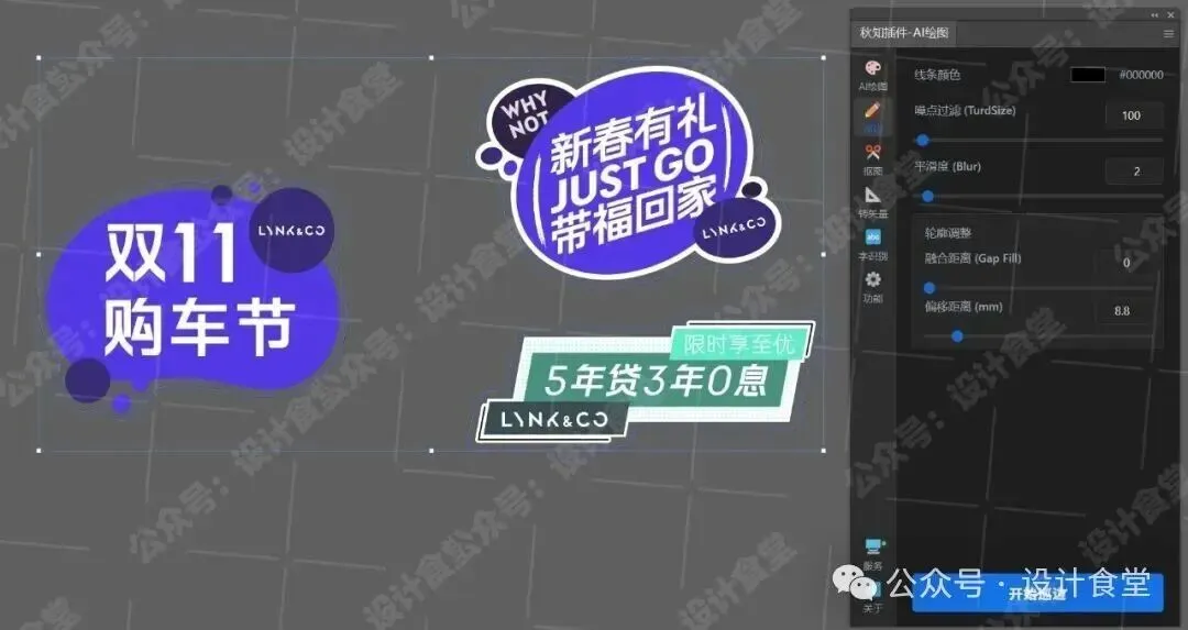 优势:省去手动钢笔工具描边的繁琐,支持保留镂空部分,路径拟合度高达50%,拐角平滑75%。
