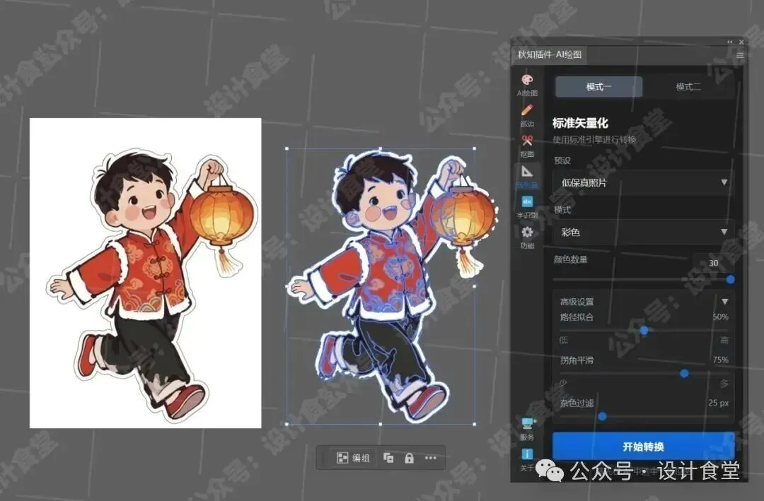 优势:比Illustrator自带“图像描摹”更智能,支持颜色分层、简化节点,颜色数量可自定义(如30色),杂色过滤25px。