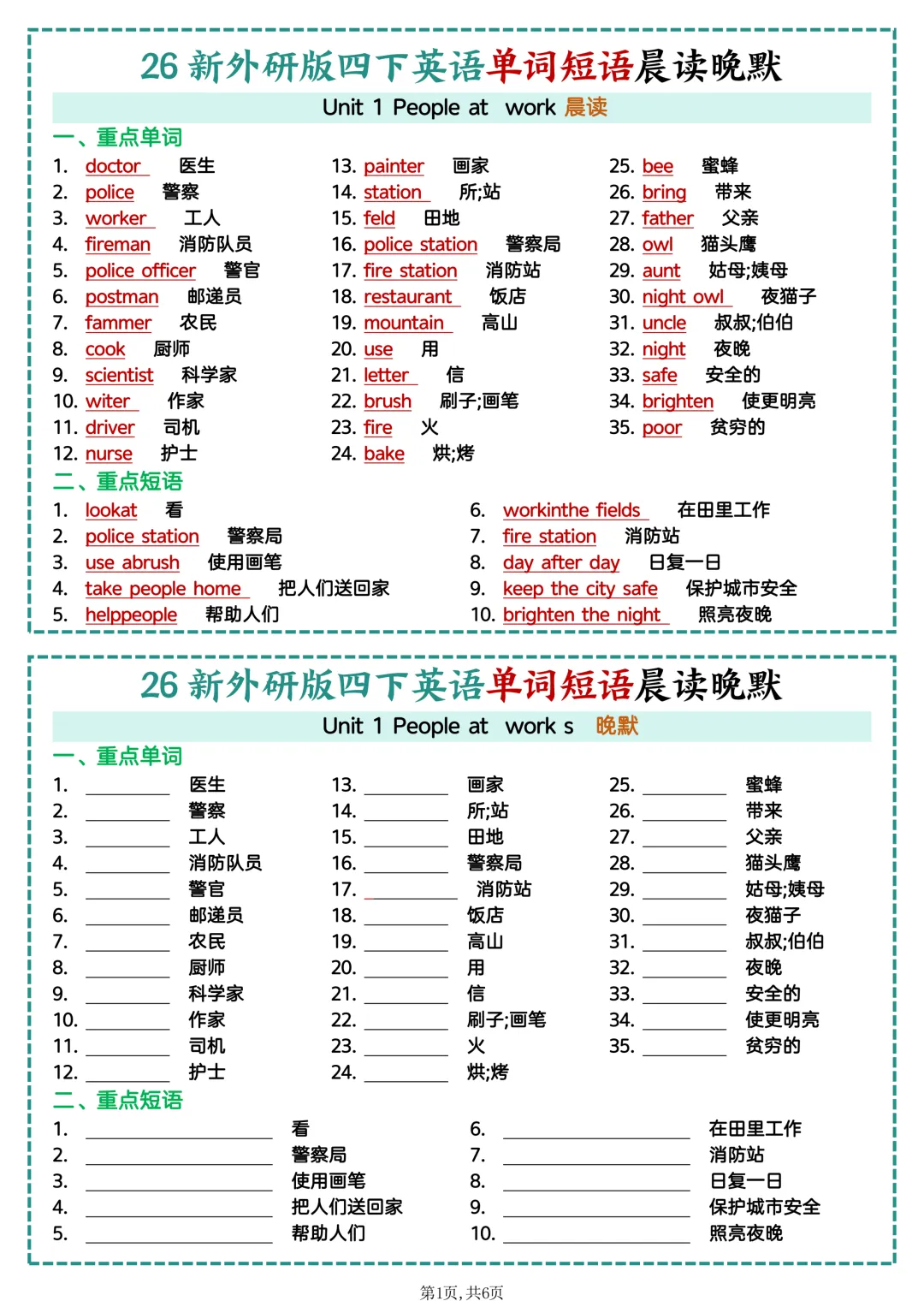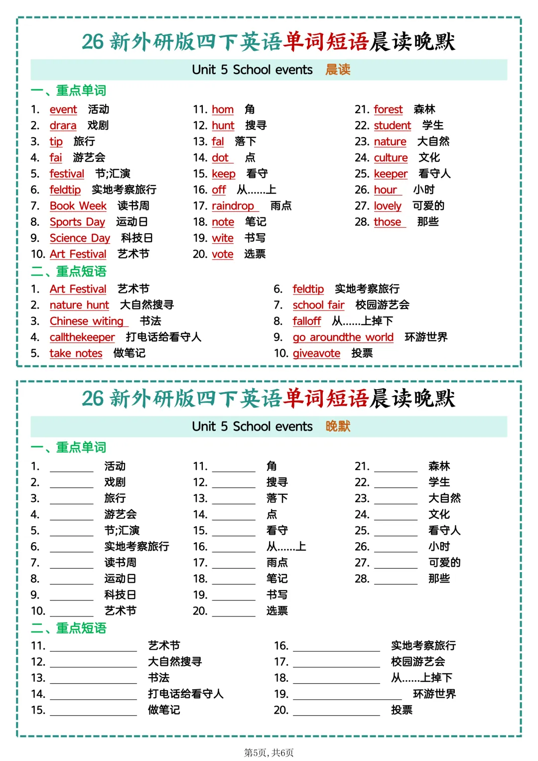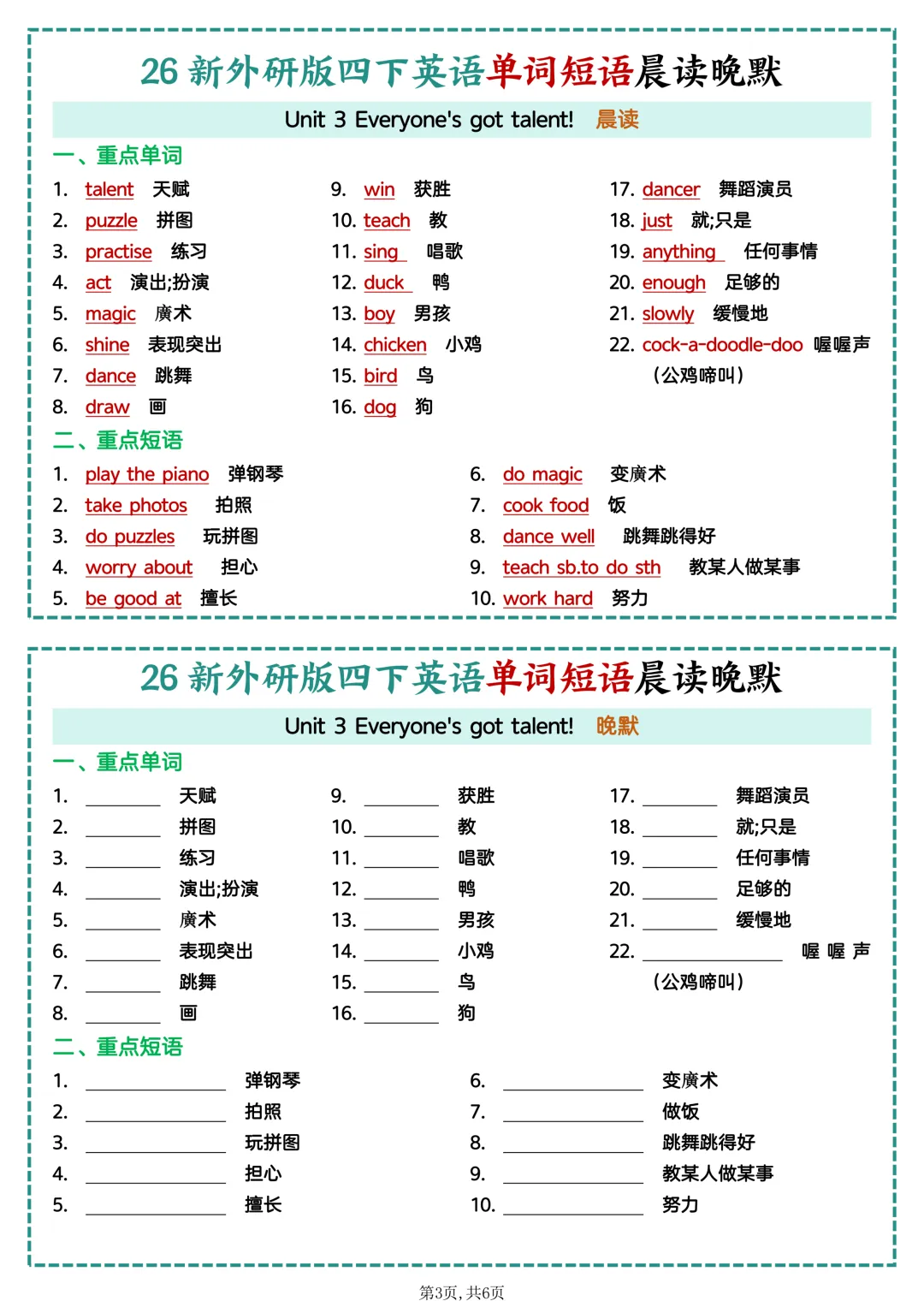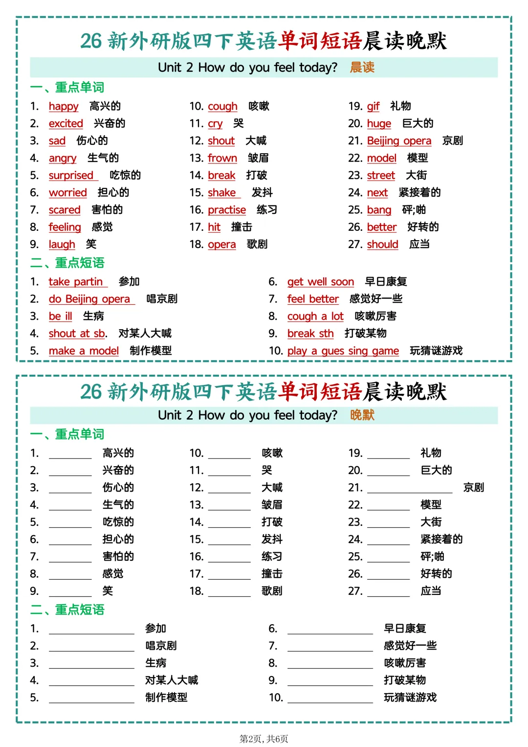 26春外研版四年级下册英语晨读晚默小纸条(电子版附下载链接)
