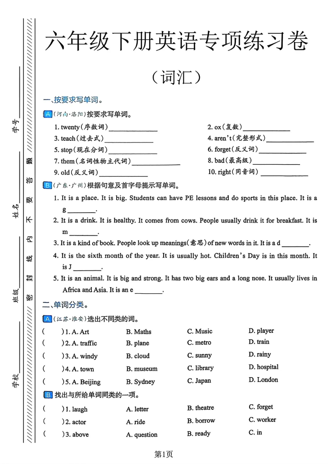 【资源免费下载】六年级(下)英语 词汇专项练习卷,PDF电子版,可打印