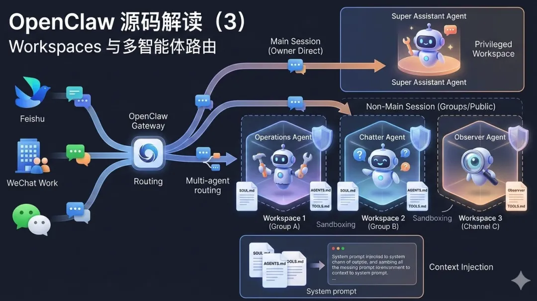如果是个人私聊,我们需要一个全知全能的私人助理;如果是群组接入,我们可能只需要一个特定领域的客服或观察者。为了解决这个场景冲突,OpenClaw 引入了非常优雅的 Workspaces(工作区) 与 多智能体路由(Multi-agent routing) 机制。