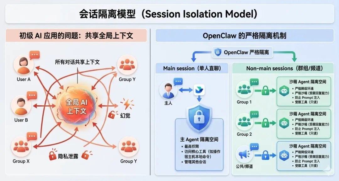 在很多初级 AI 应用中,所有的对话往往共享同一个全局上下文,这在多渠道接入时会导致灾难性的隐私泄露或幻觉。OpenClaw 在架构设计之初,就严格定义了会话隔离模型。