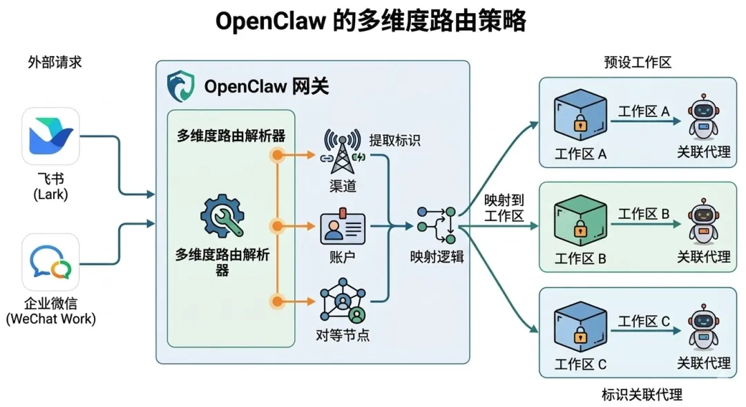 OpenClaw 采用了一种多维度的路由解析策略。它会提取入站请求的 Channel (渠道)、Account (账户) 或 Peer Node (对等节点) 的标识,然后映射到预设的 Workspace 中。