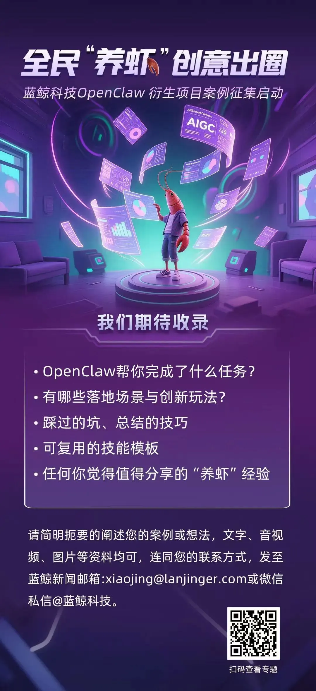 无论你是技术大神还是刚入坑的“养虾新手”,只要你让这只电子龙虾做了有趣、有用、有创意的事,我们都想听听你的故事。