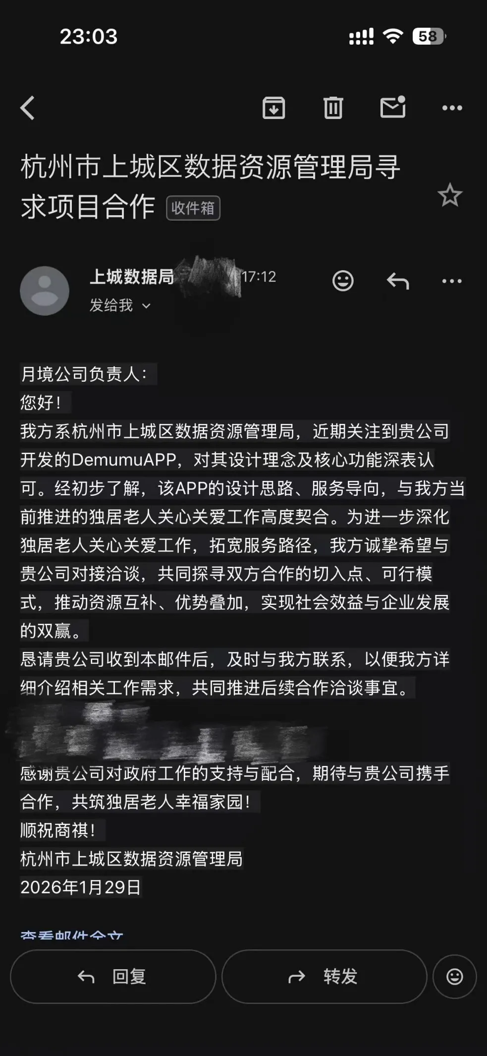 发出这封邮件的孟慧君,当时只有一个线索:这家公司的官网页面上,最底下有一行小小的邮箱。没有熟人介绍,没有前期对接,她抱着“试一试”的心态发了出去。但她写得很认真,一边写一边在想:对方会对什么感兴趣?我们上城正在做的“独居老人一件事”,和他们的理念是相通的;我们积累的数据和场景,是他们真正需要的。
