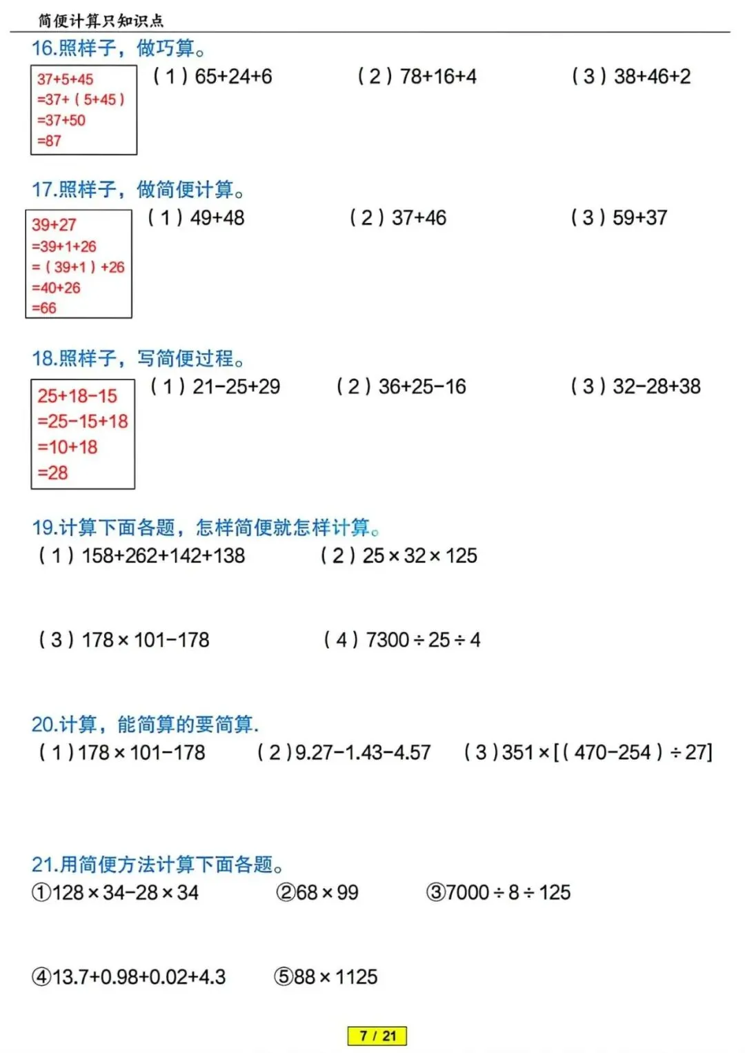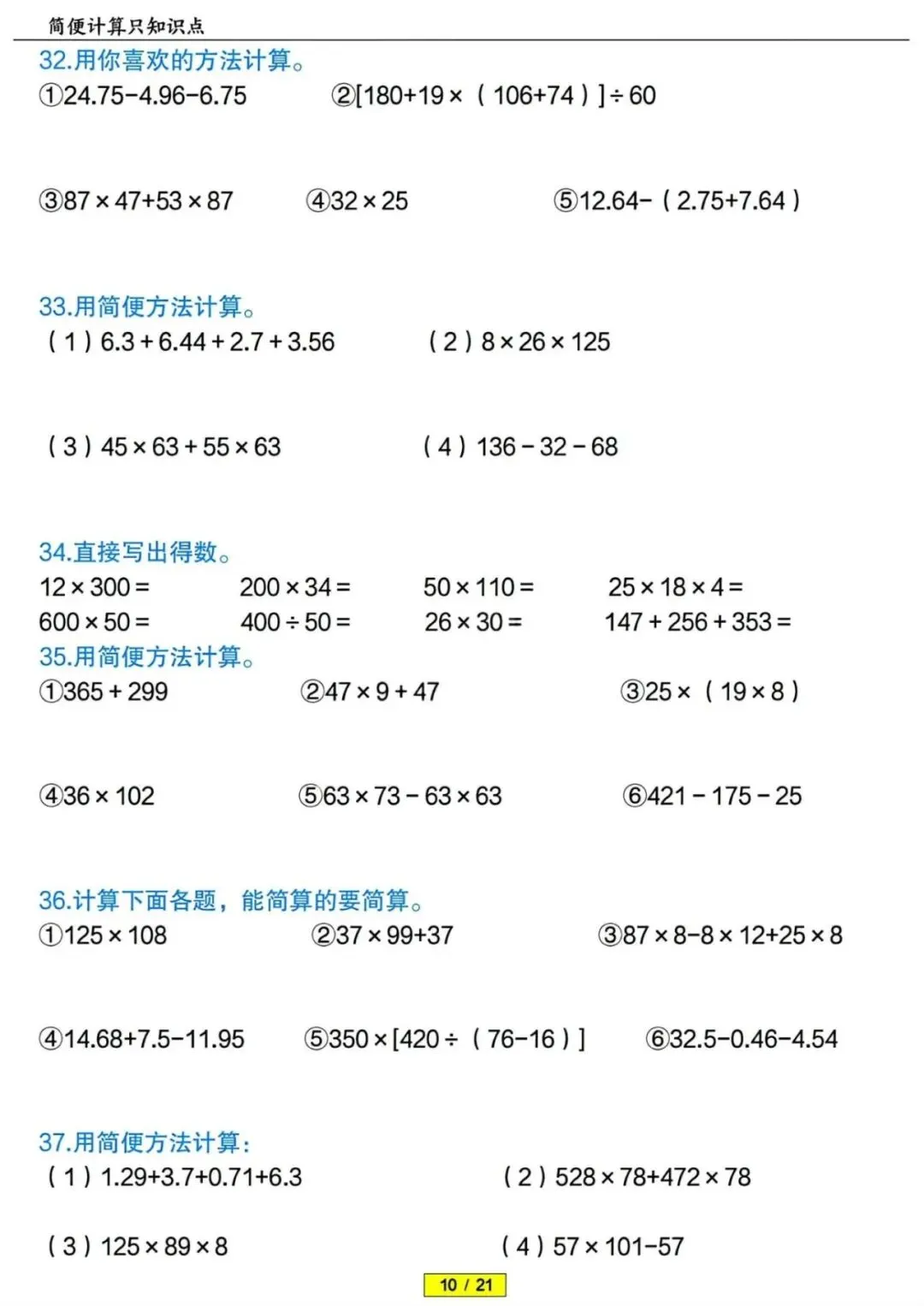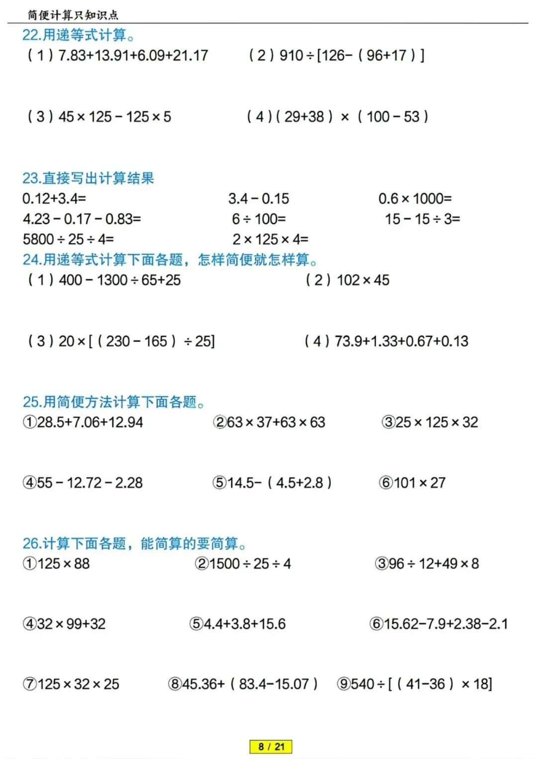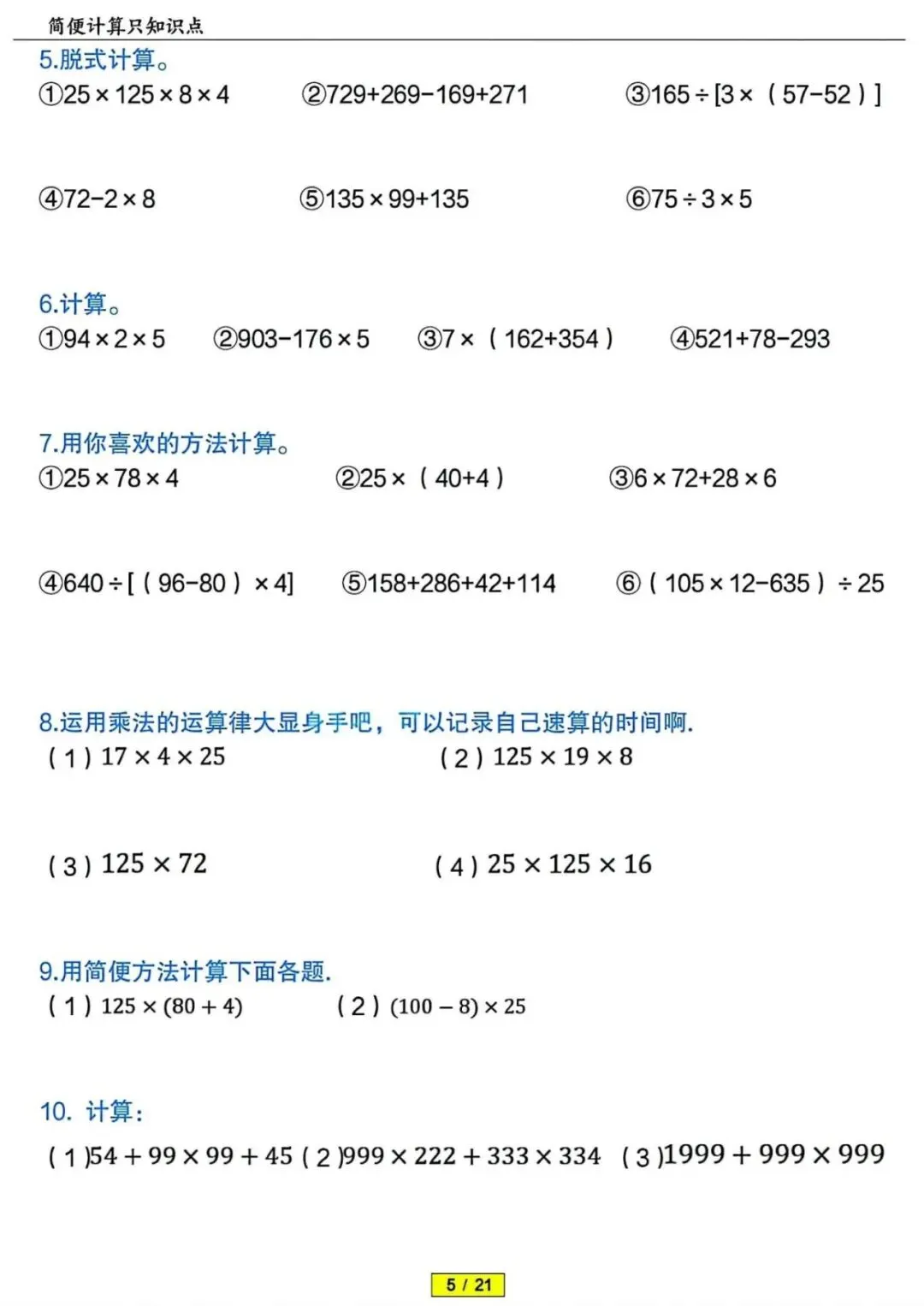 新版四年级下册数学简便计算专项训练,电子版可下载打印