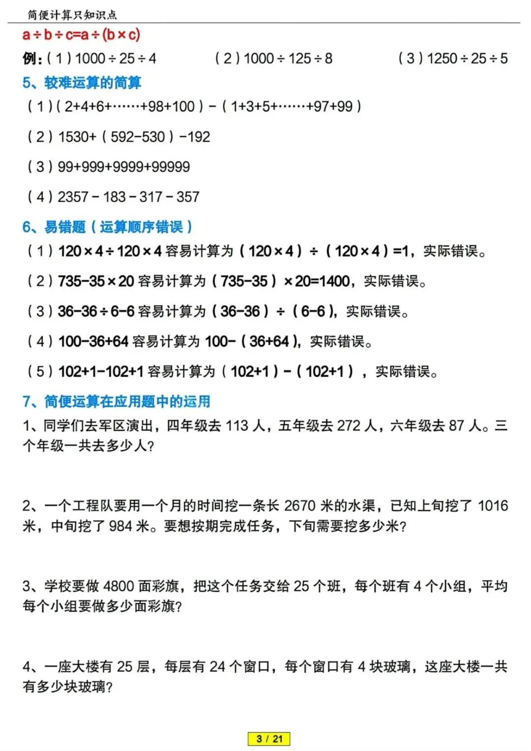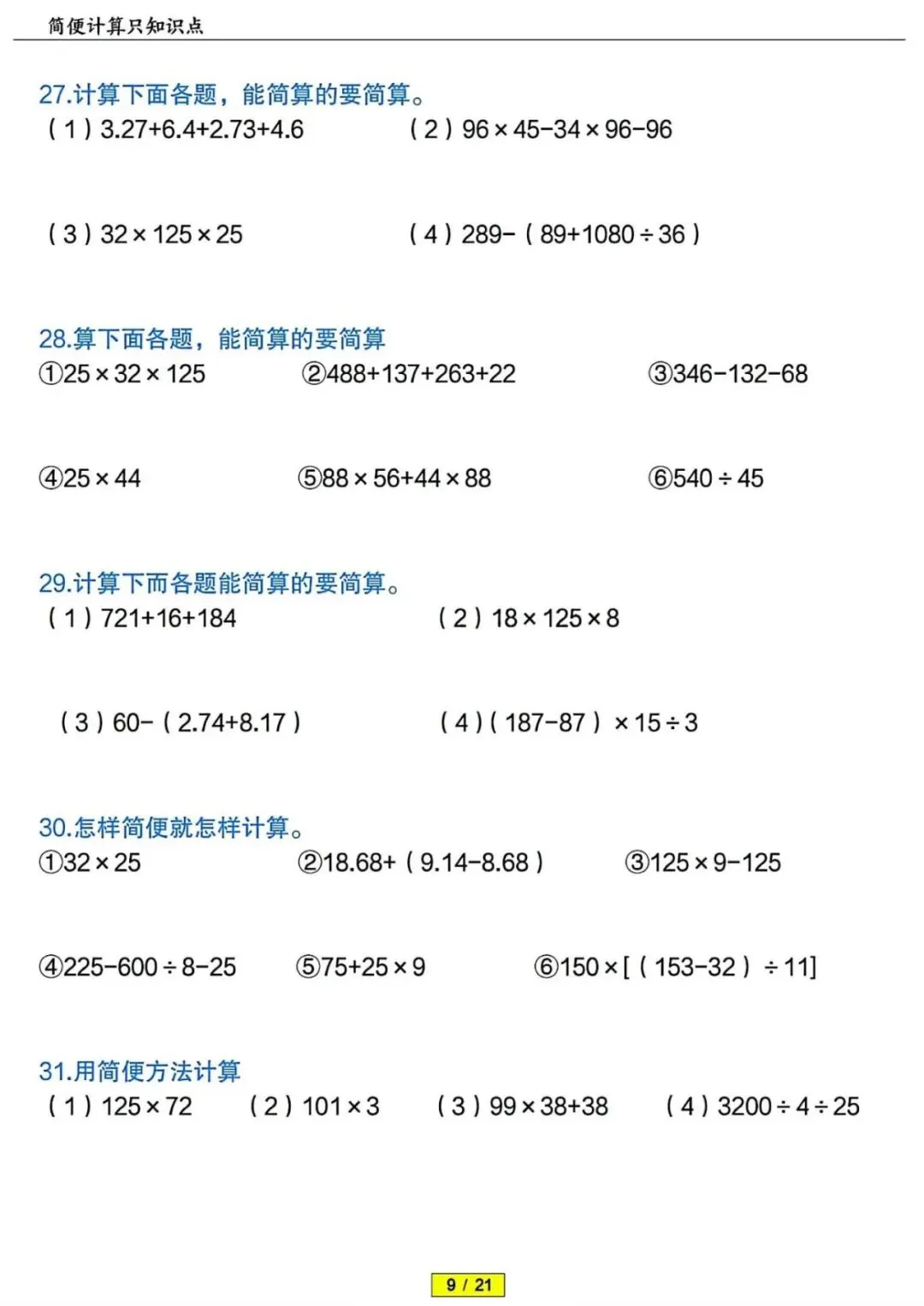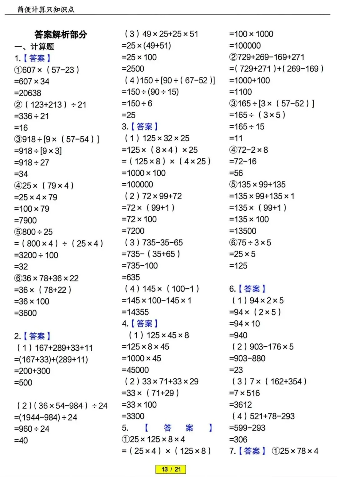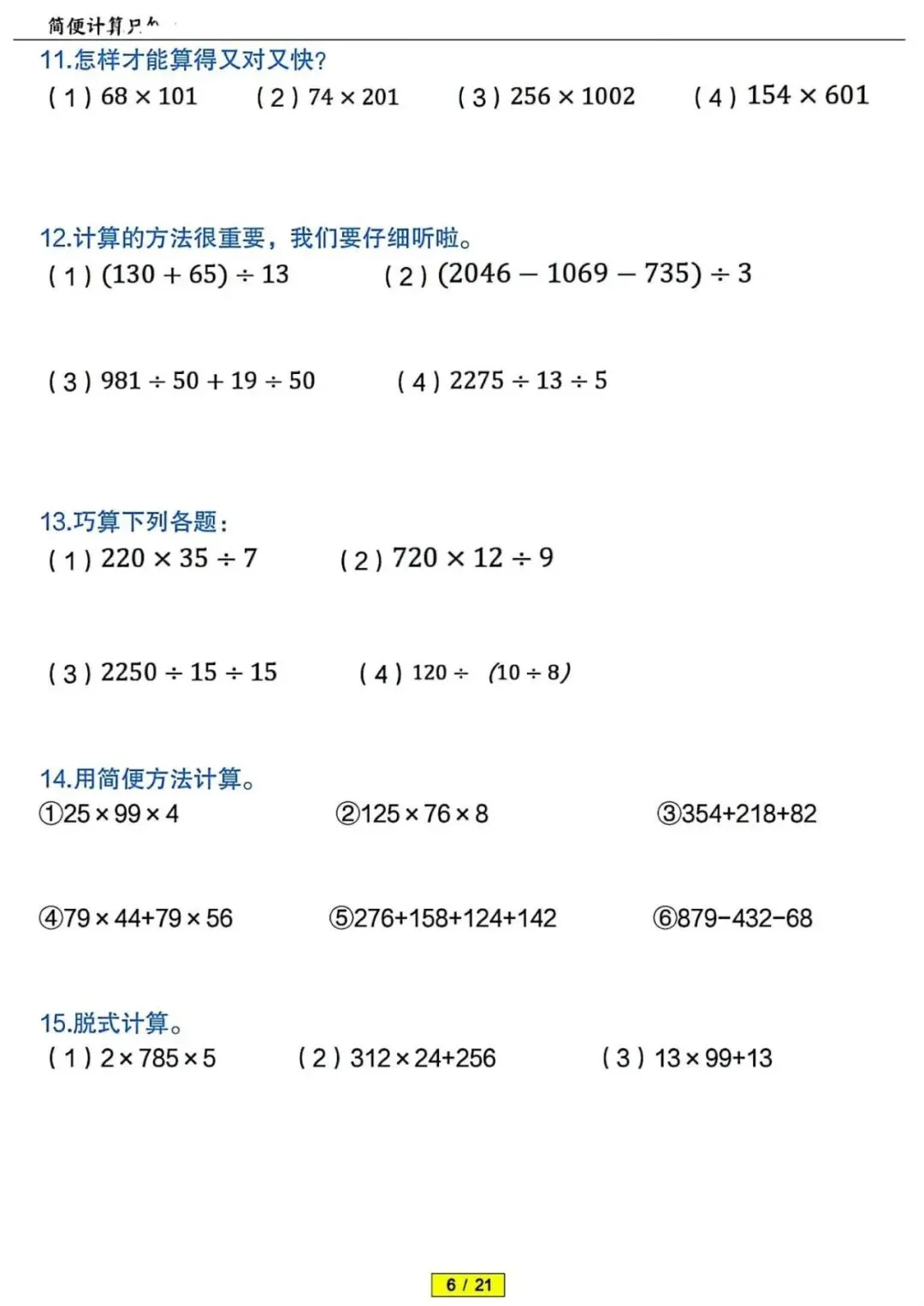 新版四年级下册数学简便计算专项训练,电子版可下载打印
