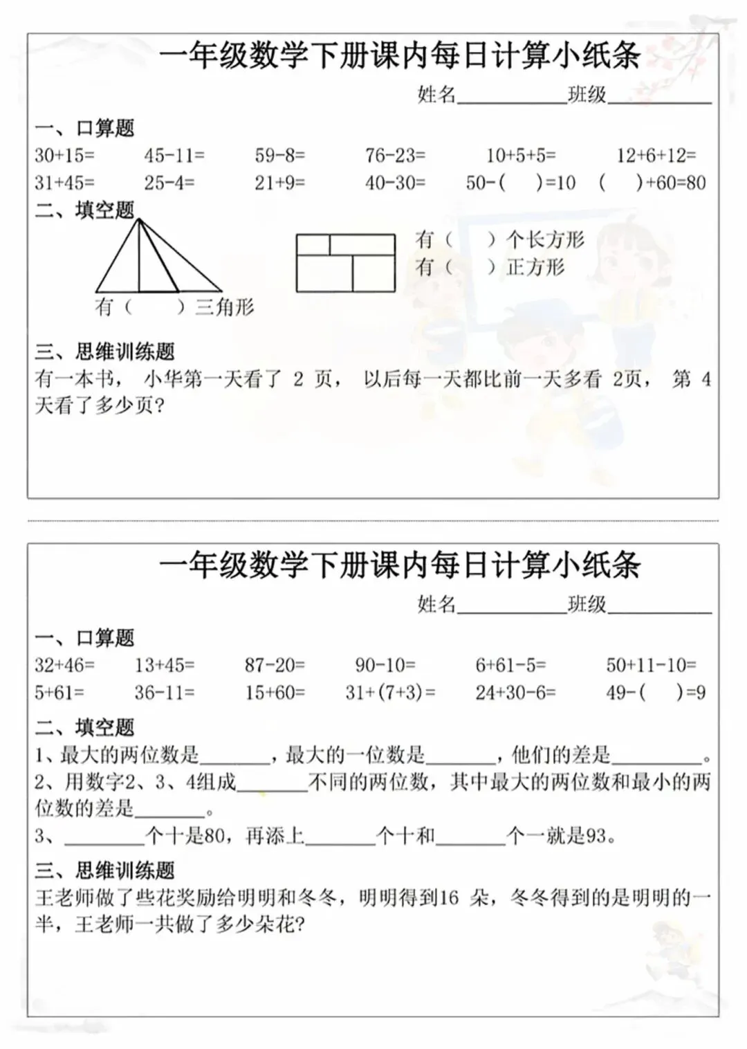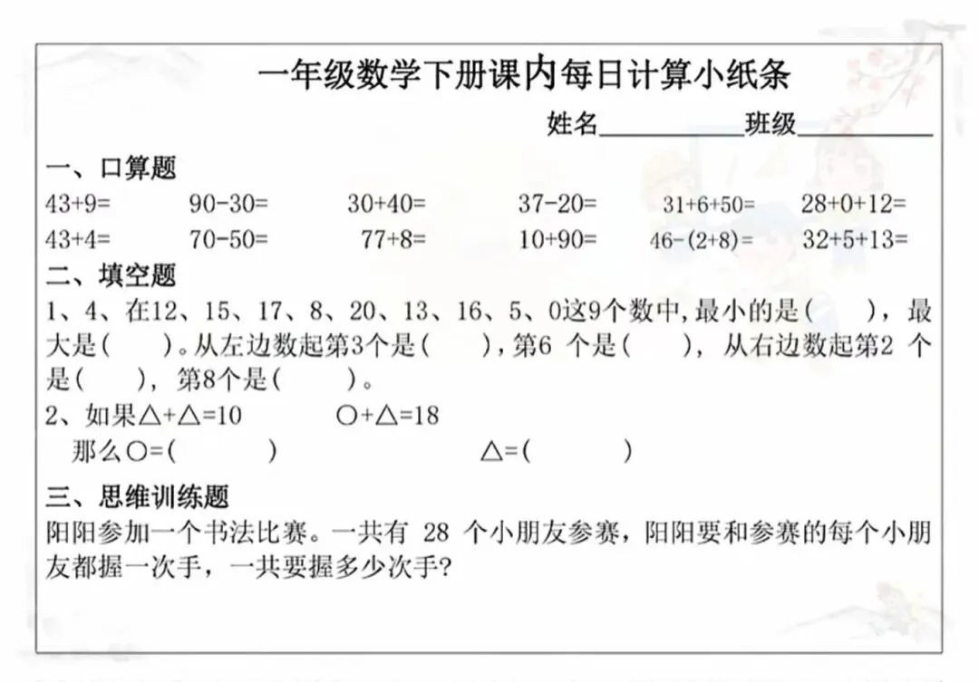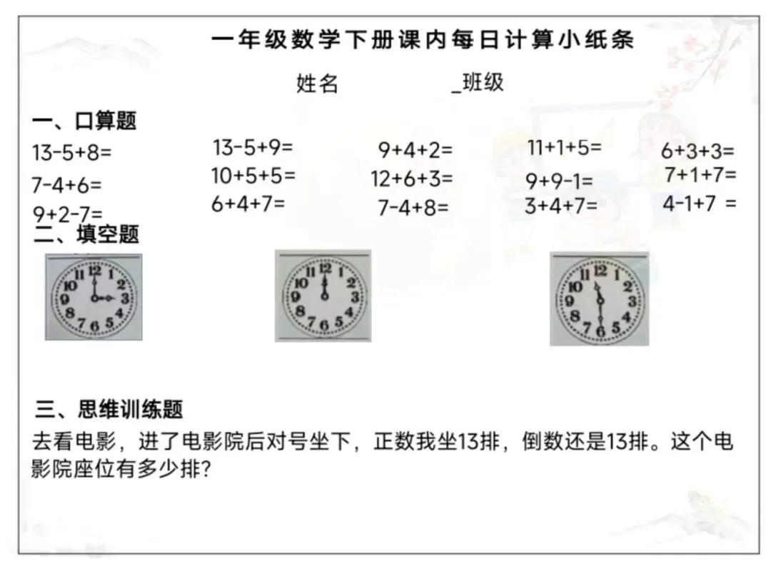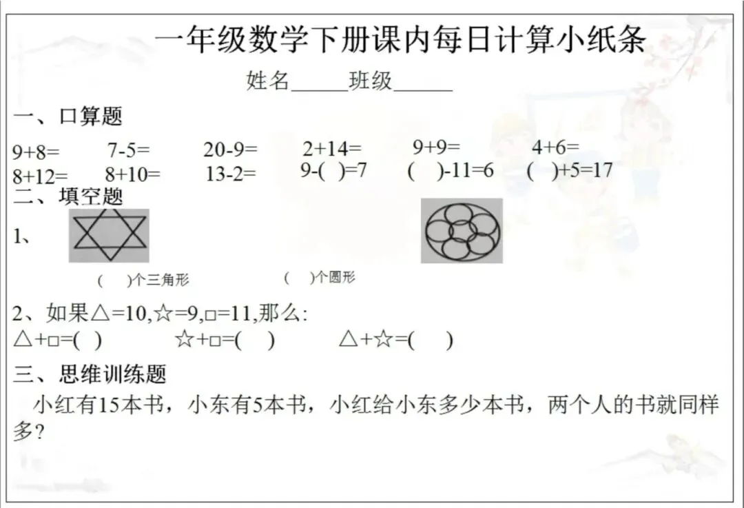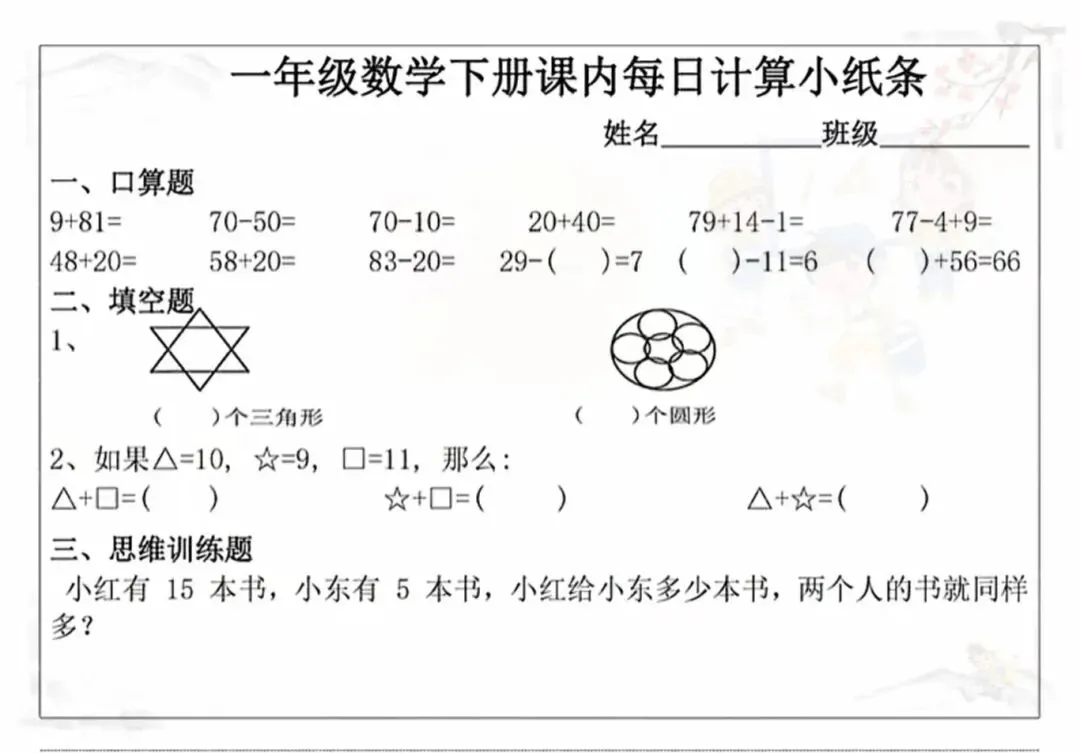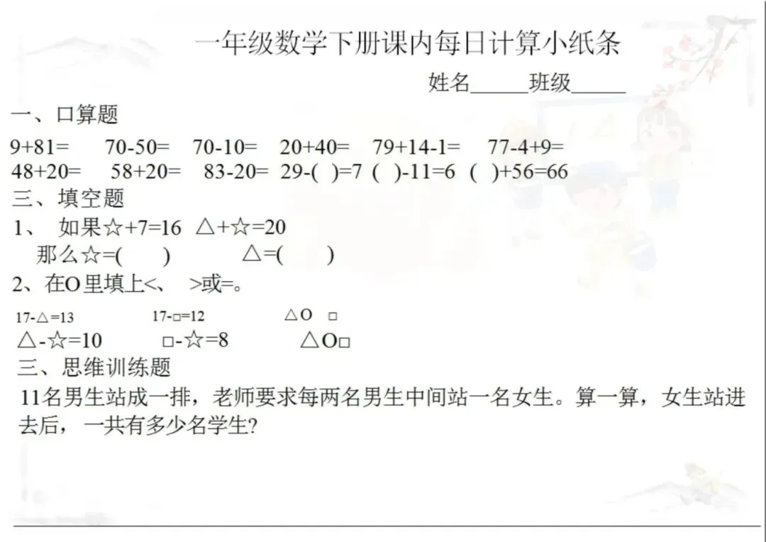 新版一年级下册课内《每日计算小纸条》电子版可打印