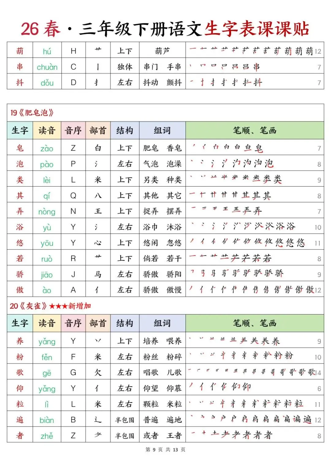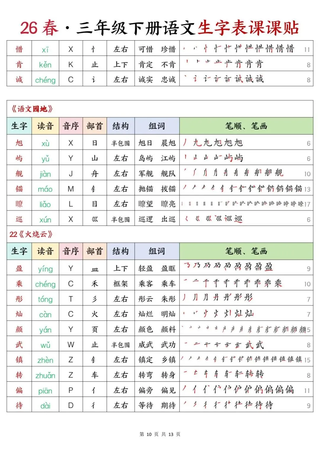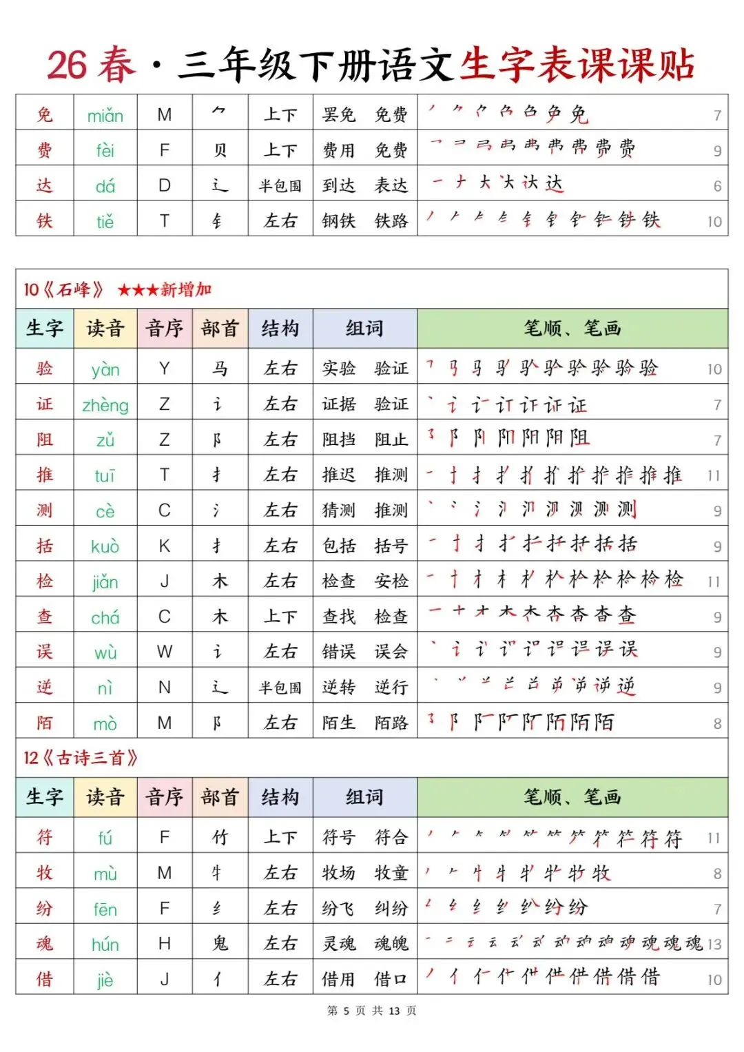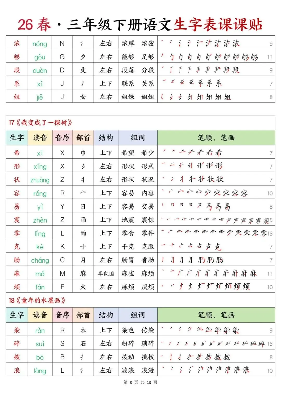 三年级下册语文 | 生字表课课贴(13页可打印)