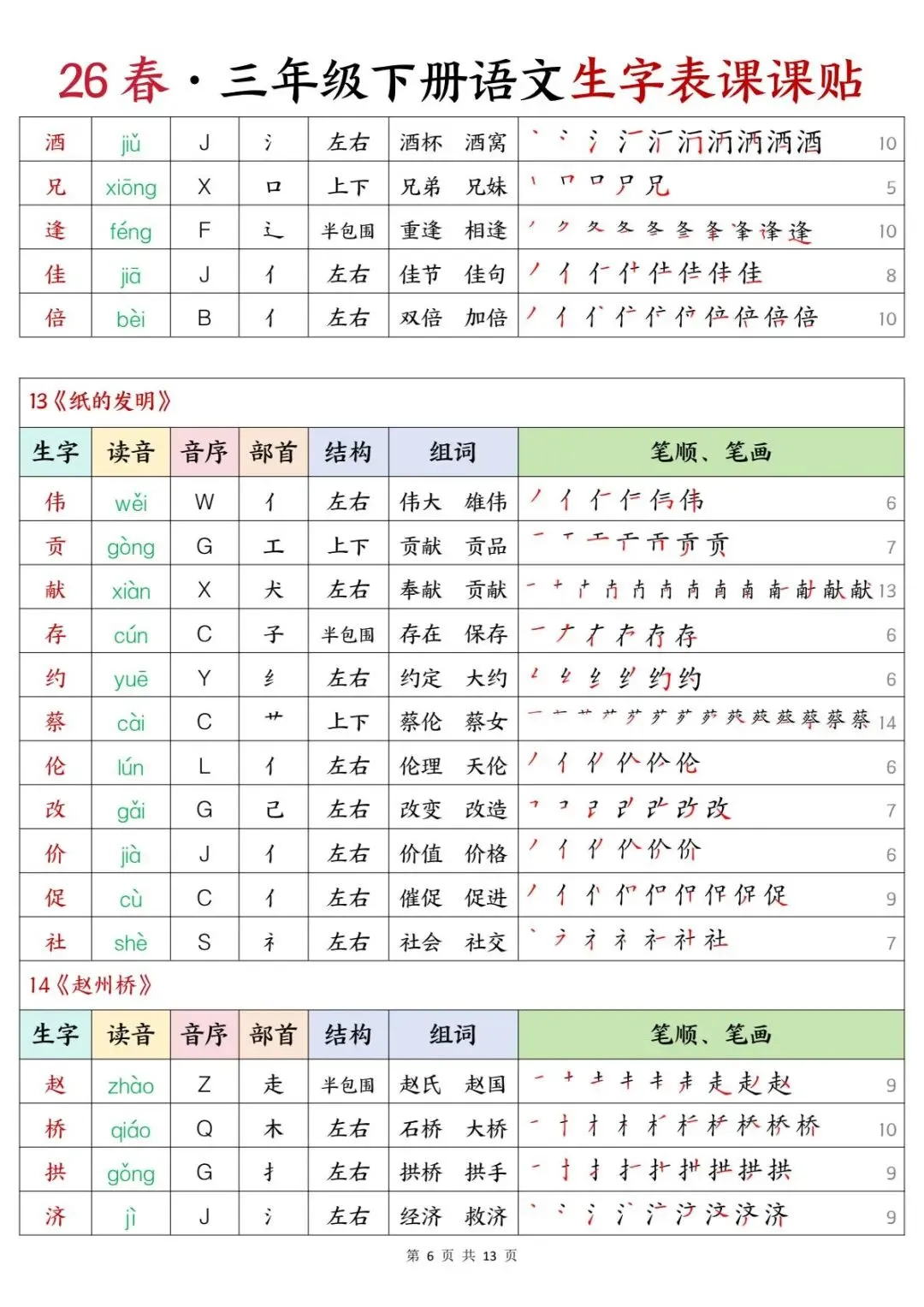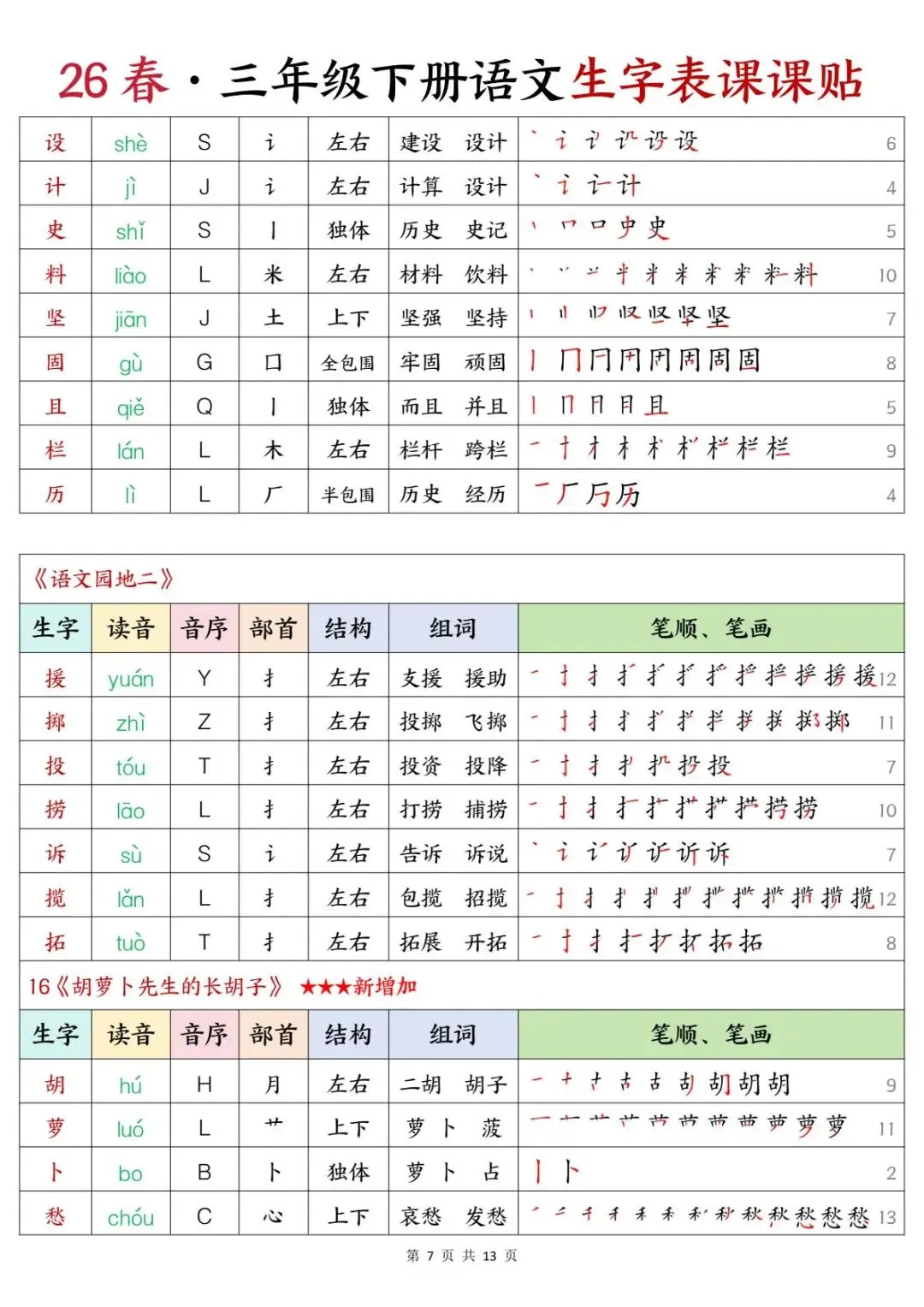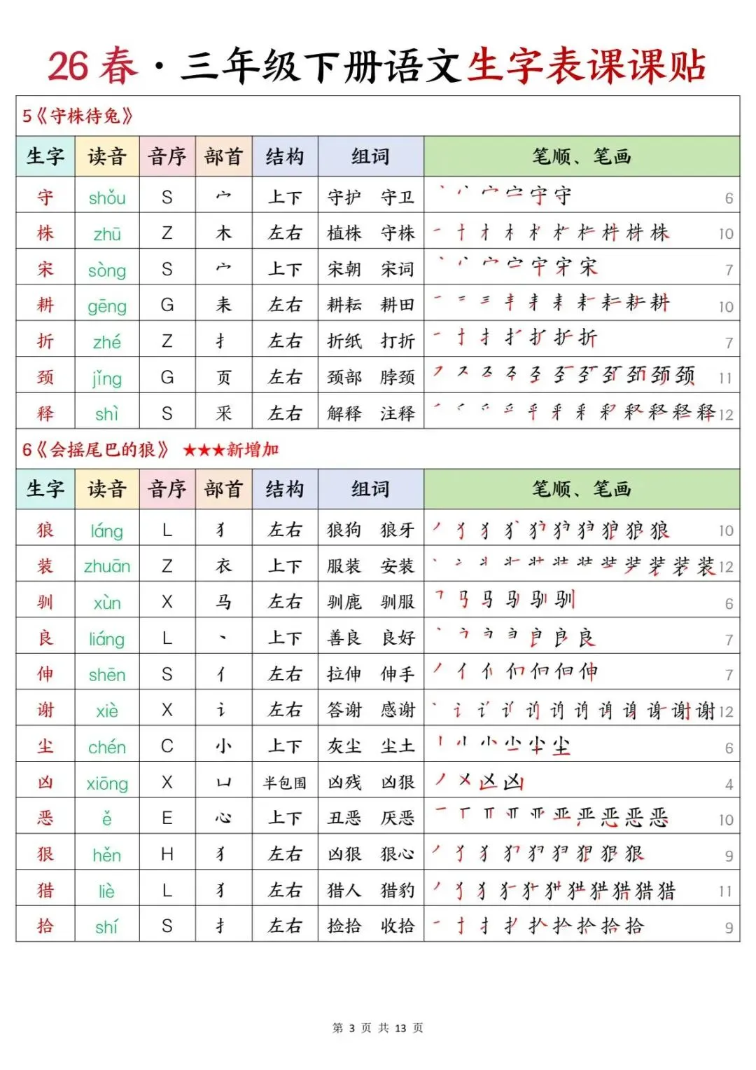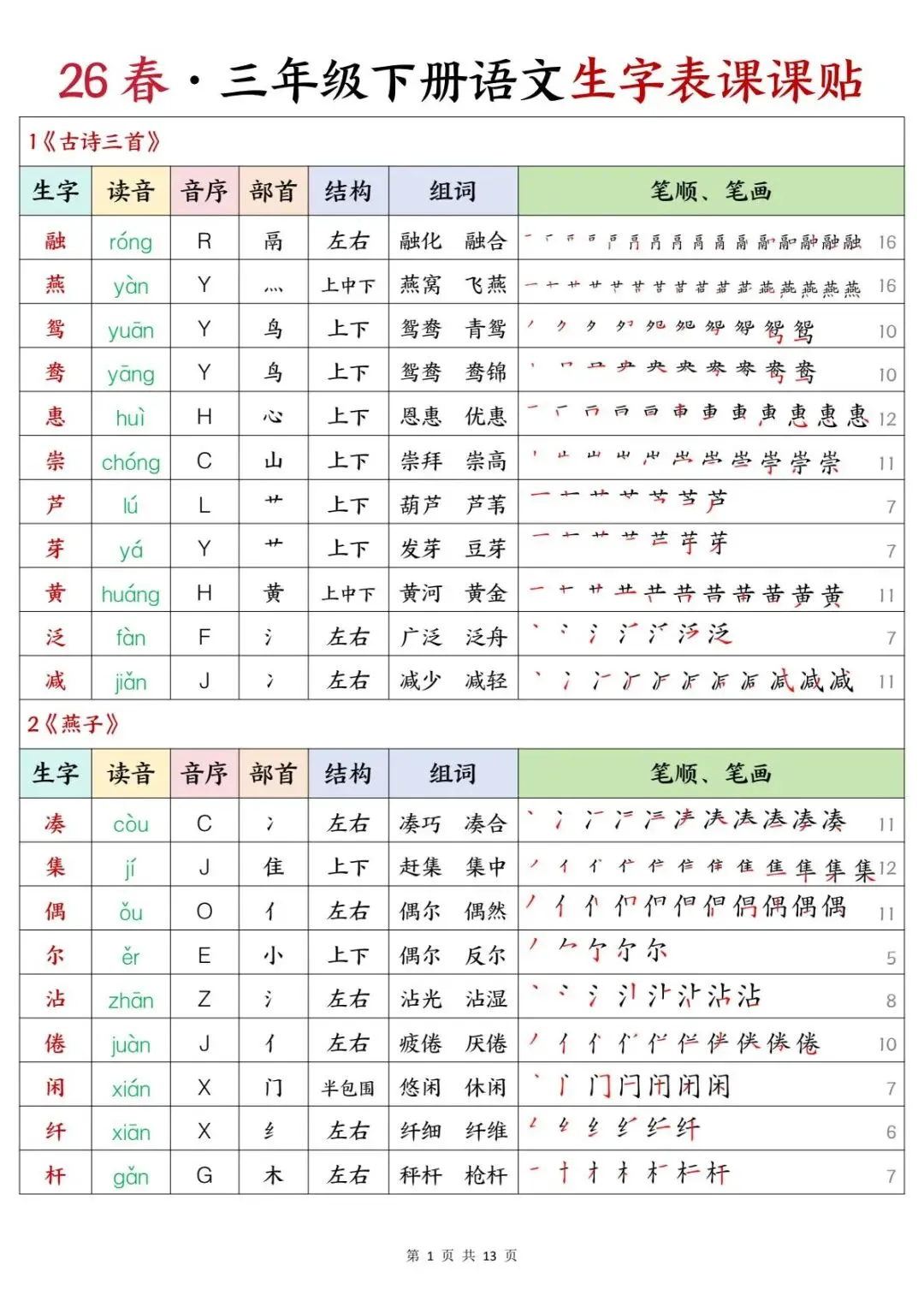 三年级下册语文 | 生字表课课贴(13页可打印)