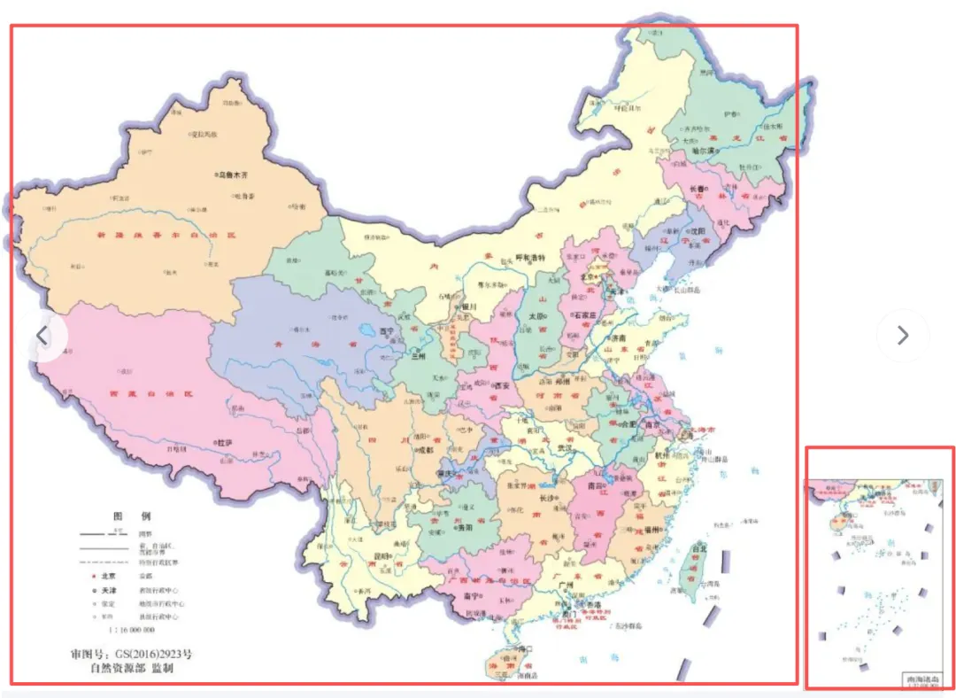 数据框是“画布+图层”,能装图层、图层组,还能玩“套娃”——比如中国地图主框+南海小插图框,就是用两个数据框来制作的(图中只用红色矩形框圈出数据框保护的大致内容,正常情况下出图中国地图是不允许有压盖的,此处仅做标记使用)。