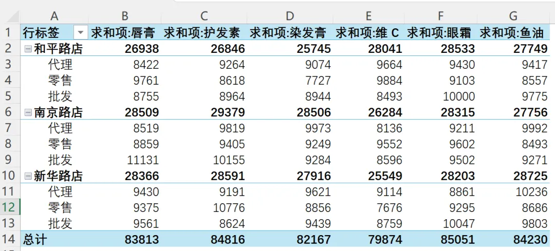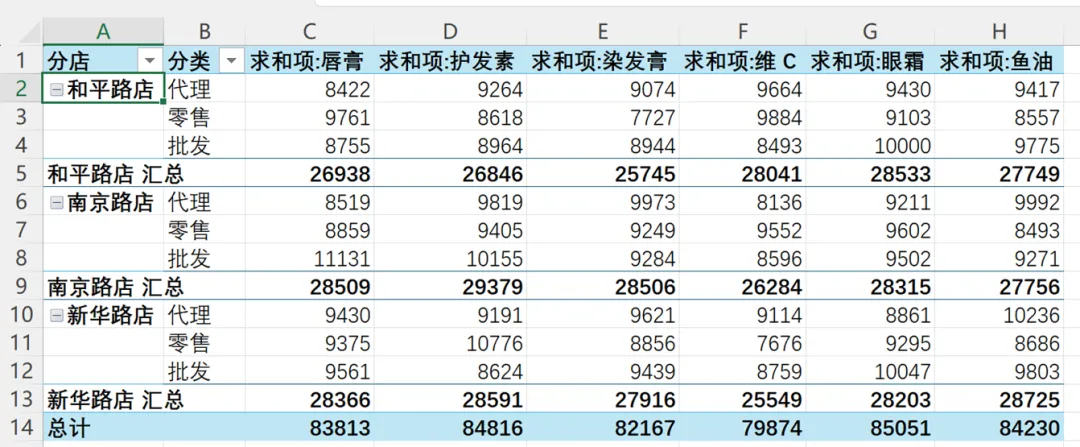 效果如下,这样得到的数据透视表中,分店名称在A列,销售渠道在B列。
