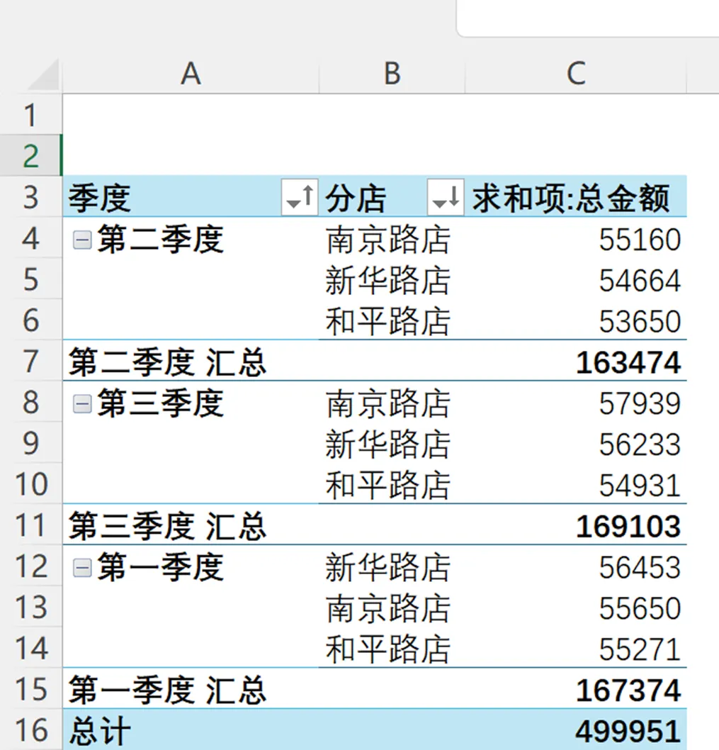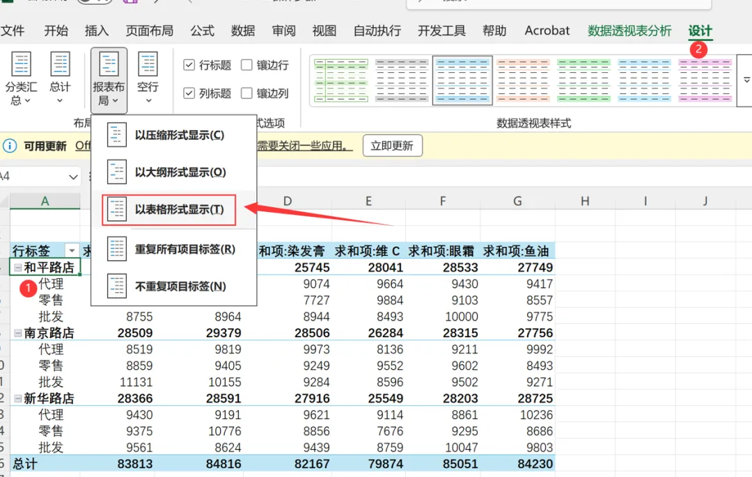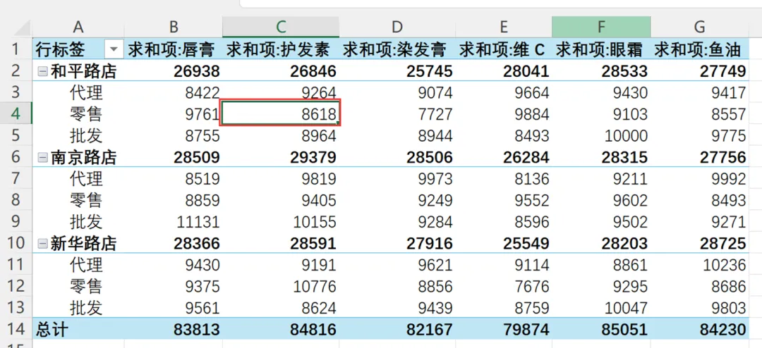 要想让分店名称和销售渠道2个字段分别在不同列上显示,可以调整数据透视表的报表布局为表格形式,选中数据透视表中的任意一个单元格都可以,操作如下: