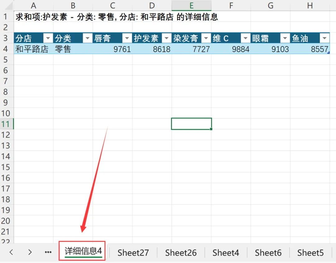 因为数据透视表里的数据都是汇总得来的,所以如果启用了显示明细数据的功能,正常双击汇总表格里的一个数据,数据透视表将从这个数据自动向下钻取,新建工作表展示构成这个汇总数据的明细数据,如上表,双击8616这个数字,就会自动生成下图sheet4一个单独的表格,内容就是8618这个数字的组成部分。