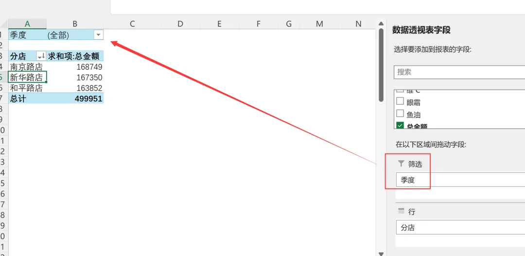 1. 将要求的拆分条件所在字段季度放置在数据透视表的筛选区域,如下图: