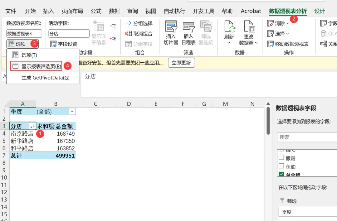 由于所有分表的报表布局和字段结构都与总表相同,所以如需调整报表结构,要先删除所有分表,然后按新的需求调整好总表的报表结构,最后利用数据透视表的报表筛选功能重新批量生成多张表格。如上面的案例,如果要求按照店铺分类,则把分店放到筛选区域内,然后在数据透视表工具里执行报表筛选功能即可。