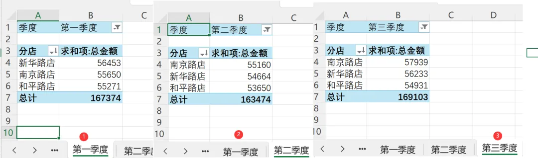 数据透视表就会执行自动拆分多表的操作,生成3张工作表,分别放置第一季,第二季和第三季的分表数据。见下图: