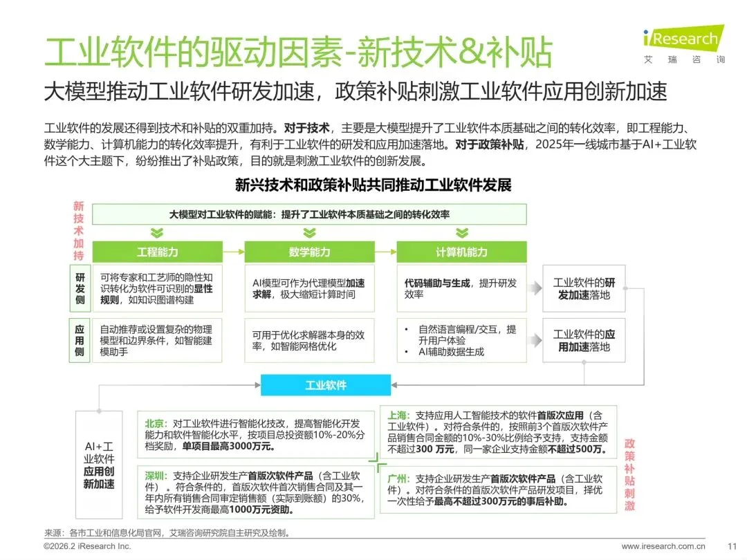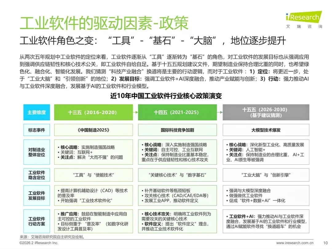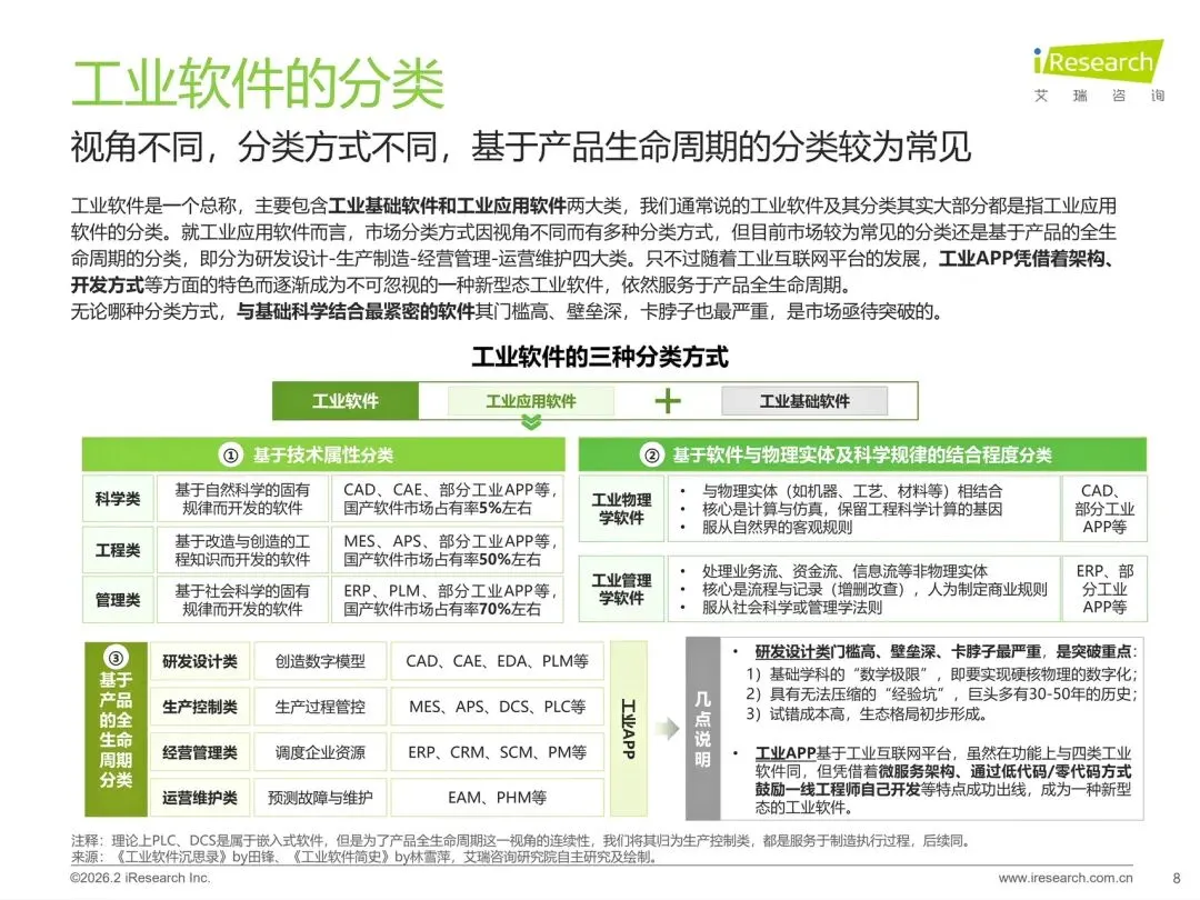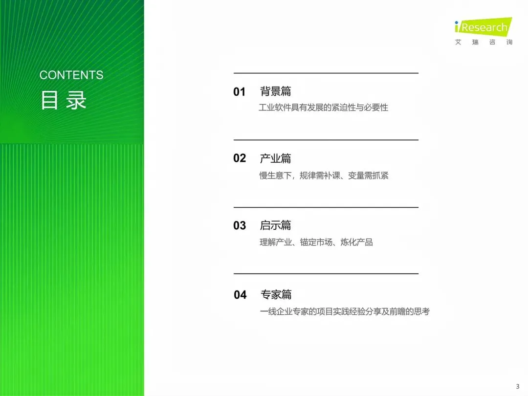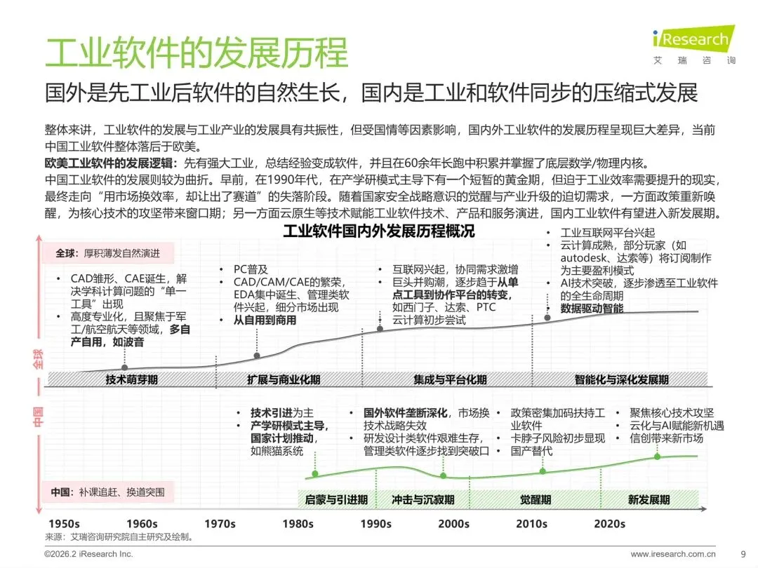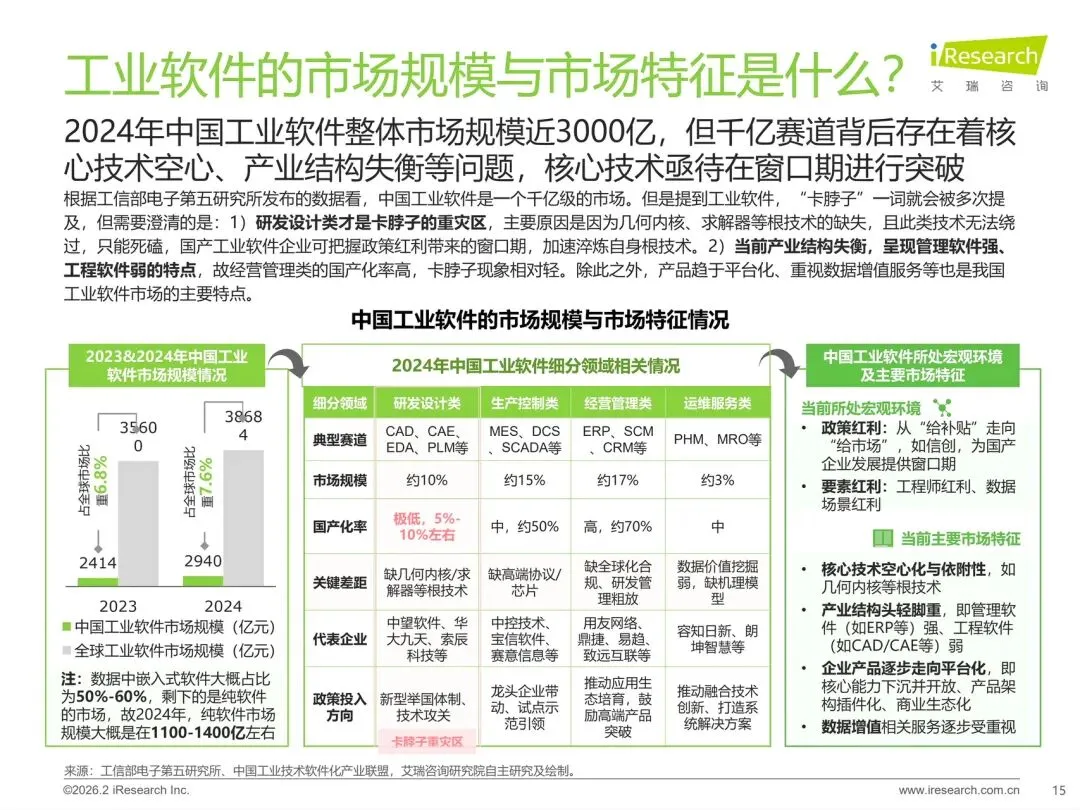 中国工业软件行业发展研究报告告 中国的工业软件市场千亿的大盘子,2024年市场接近3000亿,市场增长稳健,但核心技术空心、产业结构失衡等问题凸显。当前,研发设计类工业软件是卡脖子最为严重,其本质是与数学与基础学科相关的根技术缺乏海量真实工业场景试错进行工程优化,表现为实体就是核心组件/引擎层受限。值得注意的是,根技术的突破没有捷径可走,只能死磕。 工业软件的慢表现为:“研发-使用-反馈-迭代”的闭环是产品得以成形并好用的必经之道,且是持续的。当产品走向成功后,经过资本并购等途径,企业逐步走向“工具-套件-平台”之路,进而成长为行业巨头。 当前,工业软件正在经历变化与重构:云原生、AI/大模型加速了工业软件的发展,甚至为工业软件换道带来了可能;工业APP带来了产品形态的变化,降低了使用门槛; 渠道商需要应对新的产品服务;数据资产带动管理重塑。工业软件产业处于动态发展中,未来产业、市场、产品的发展方向值得探讨与思考。 1)针对产业:工业软件核心演变路径为工具-系统-平台-基因,前两个阶段主要针对产品服务范围,后两个阶段主要针对数据价值。 2)针对市场:市场盘子大,但企业需要根据自身情况瞄准市场。头部客户既是主要客户群,又有国产替代和信创的需求,为工业软件技术突围带来可能;腰部客户可以成为共同体;长尾客户有助于扩大营收空间。 3)针对产品:当前工业软件主要是买产品,未来,随着数据资产的有效积累 与利用,工业软件将走向卖“智慧”的阶段,表现为工业智能体的诞生。 【最新行业报告库】包含50000+报告。报告合集:人工智能、储能、新能源汽车、机器人、医药、旅游、消费、智能制造、教育、医药、交通等。 2026脑机接口专题报告( 7份 ) 2025面SOC芯片需求及竞争格局报告 2025年具身智能产业链分析报告 硫化物全固态电池负极材料进展报告 2025 固态电池设备的瓶颈-等静压 一文读懂Sora2核心点 居民口腔健康消费报告2025 2025年 中国人幸福感报告 数据中心及AI服务器液冷冷却液 2025 脑机接口报告2025 汽车轻量化材料研究报告 小家电行业发展趋势分析2025 一文看懂减速器产业链(机器人核心)