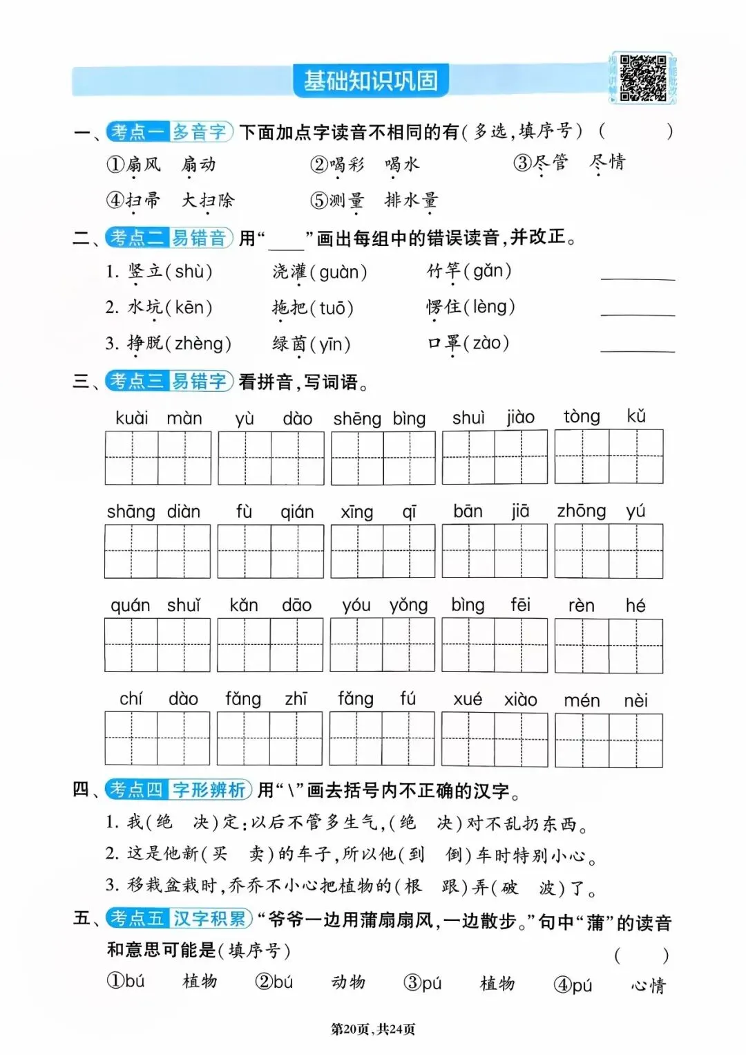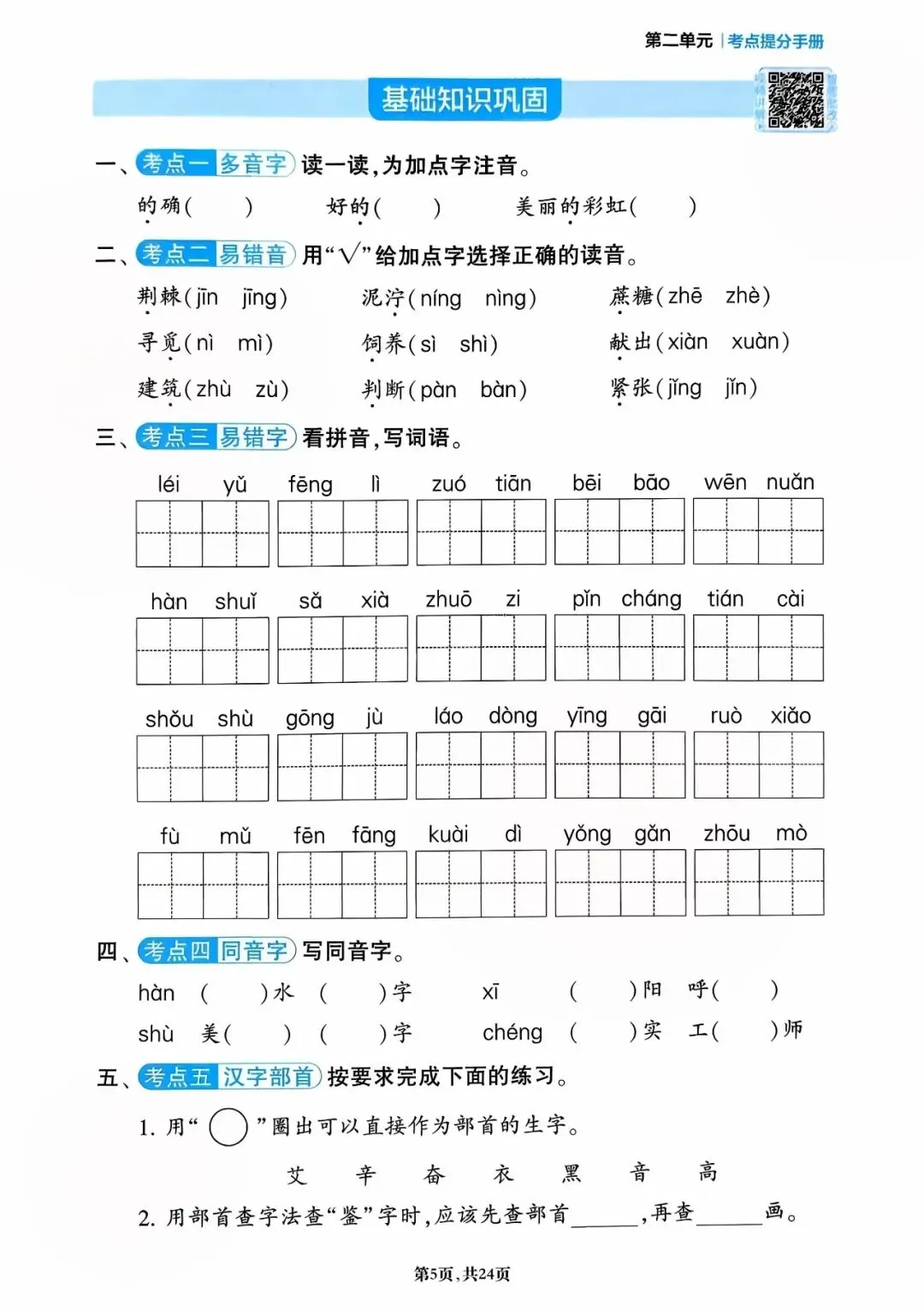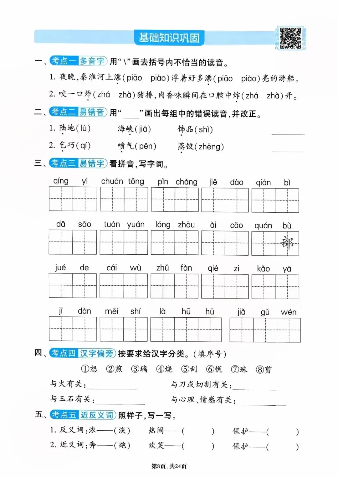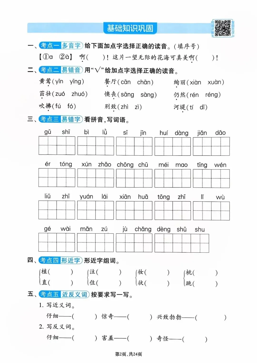 ✅ 生字词:会认会写,夯实字词基础 ✅ 多音字:单元易混读音对比记忆 ✅ 重点词语:AABB、动词搭配等归类积累 ✅ 近反义词:快速扩充词汇量 ✅ 日积月累:古诗、名言、成语全收录 ✅ 基础练习:配套巩固,即学即练