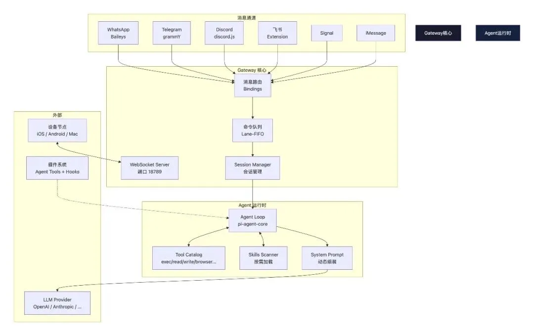 OpenClaw 是一个开源的多通道 AI Gateway,能将 WhatsApp、Telegram、Discord、飞书等即时通讯工具统一接入 LLM Agent。本文从架构设计到源码路径,带你拆解这个项目的核心骨架。