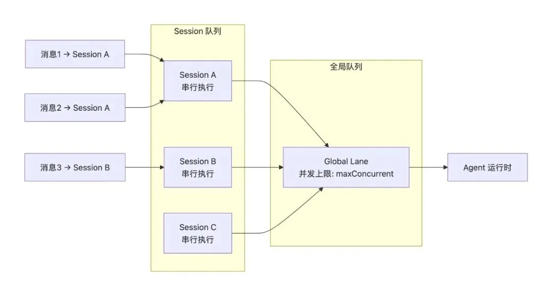 • Session 内串行:同一 Session 的消息严格排队,避免 Session 文件竞争