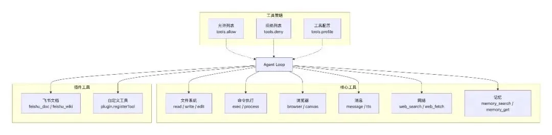 OpenClaw 内置 20+ 核心工具,覆盖文件操作、命令执行、浏览器控制、消息发送等: