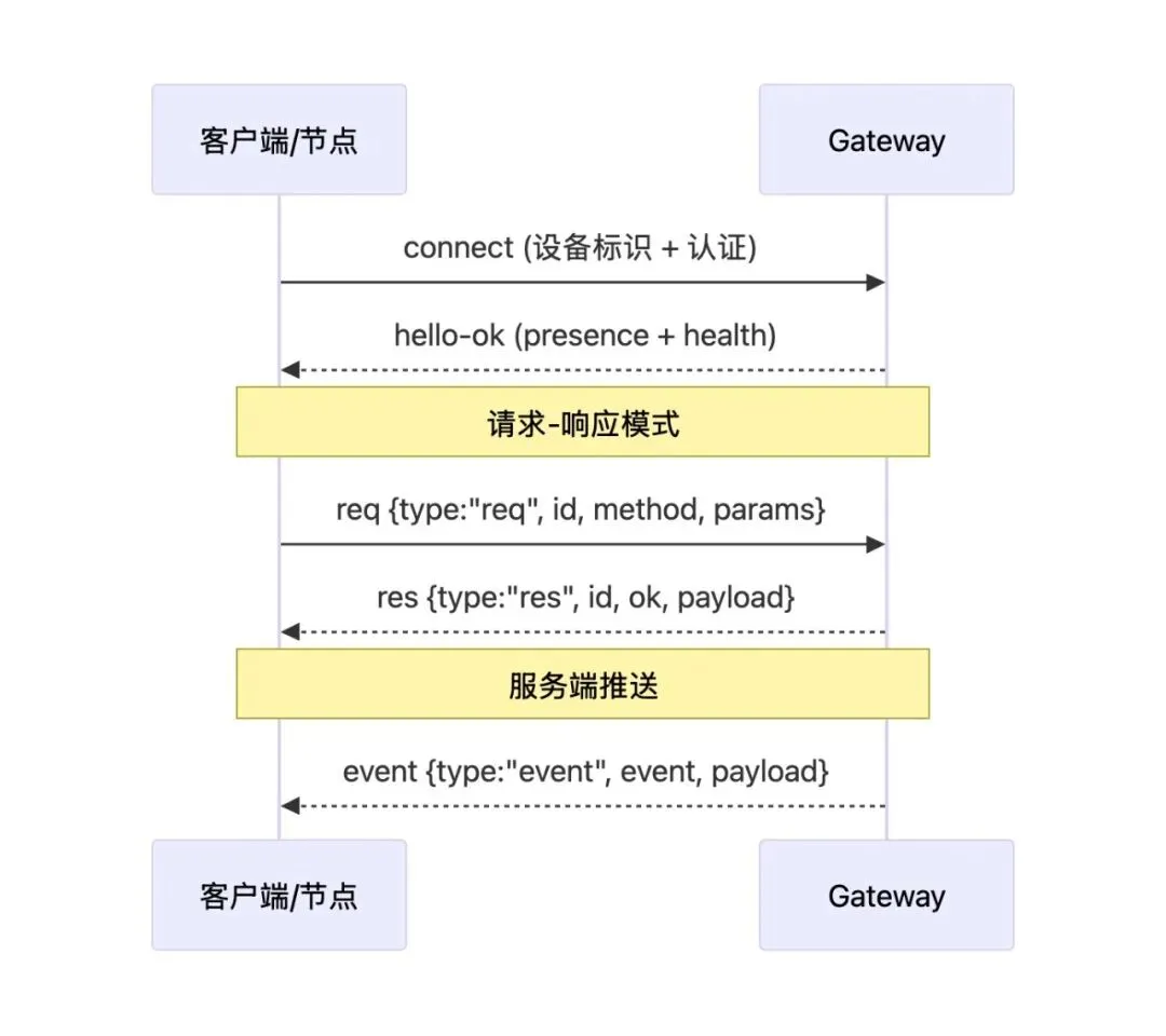 Gateway 的通信协议基于 WebSocket,纯 JSON 文本帧: