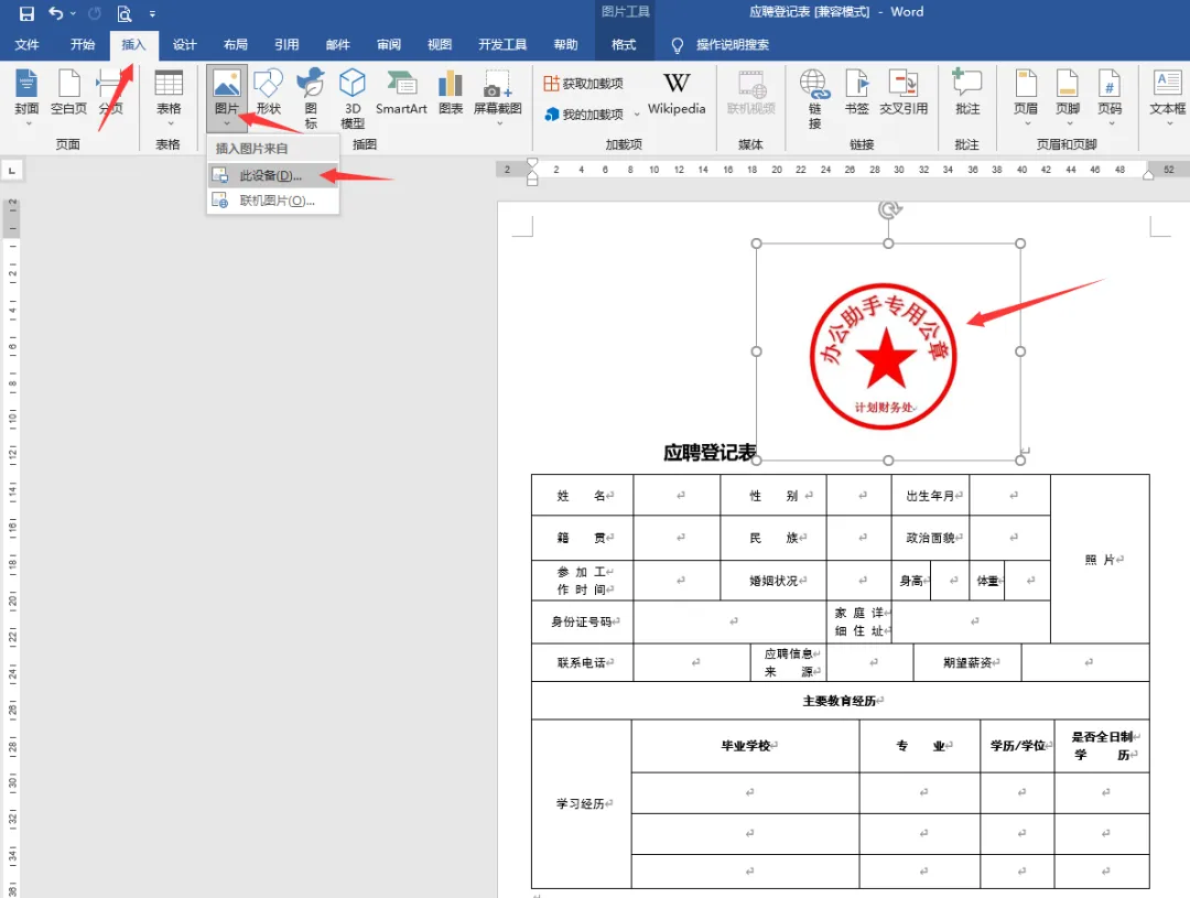 在Word中处理公章抠图,首要任务是正确导入图片并调整其环绕模式。通过点击“插入”选项卡,选择“图片”中的“此设备”,浏览并选定需要处理的公章图片,点击“插入”将其添加至文档。