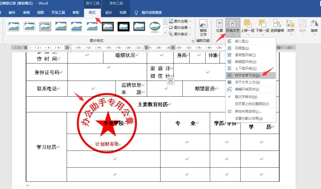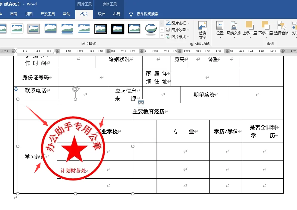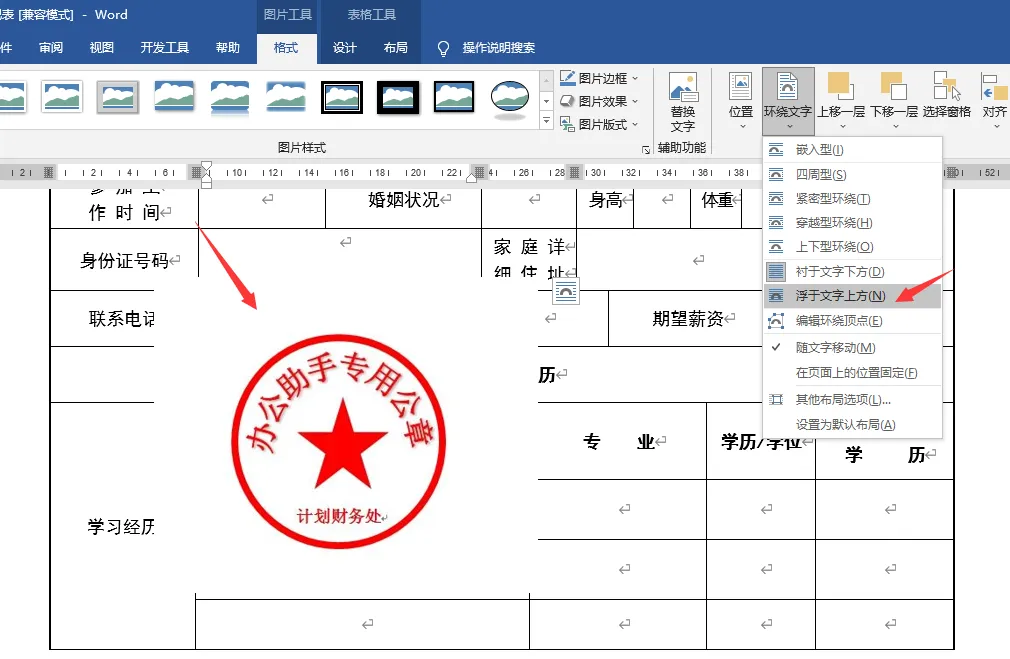 此时,公章图片默认以嵌入型环绕模式呈现,这种模式虽简单直接,但容易遮挡表格线条或文字内容,影响信息展示。因此,需对图片环绕模式进行适当调整,以确保公章图片与文档内容和谐共存。