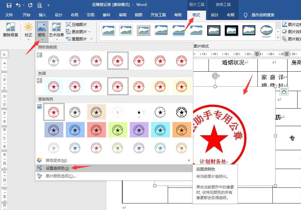 若公章图片带有白色背景,直接插入文档会显得突兀且不专业。为去除这一背景,可巧妙利用Word的“设置透明色”功能。