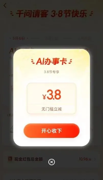 3月6日下午,阿里旗下的千问APP突然说要过妇女节,请用户免费领一张AI办事卡,打开就能用,买花、订外卖、买东西,只要喊一声帮我一下,立马减几块钱,记者试了下,随手抽到一张三块八的券,钱不多,但真省事。
