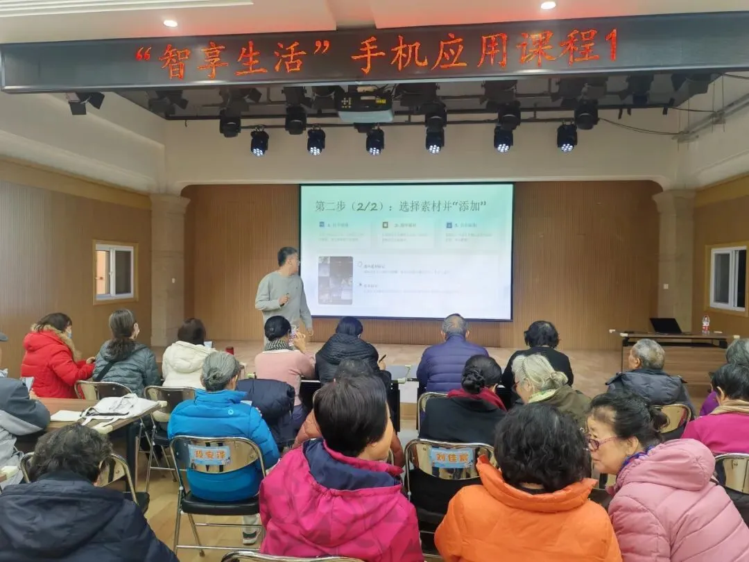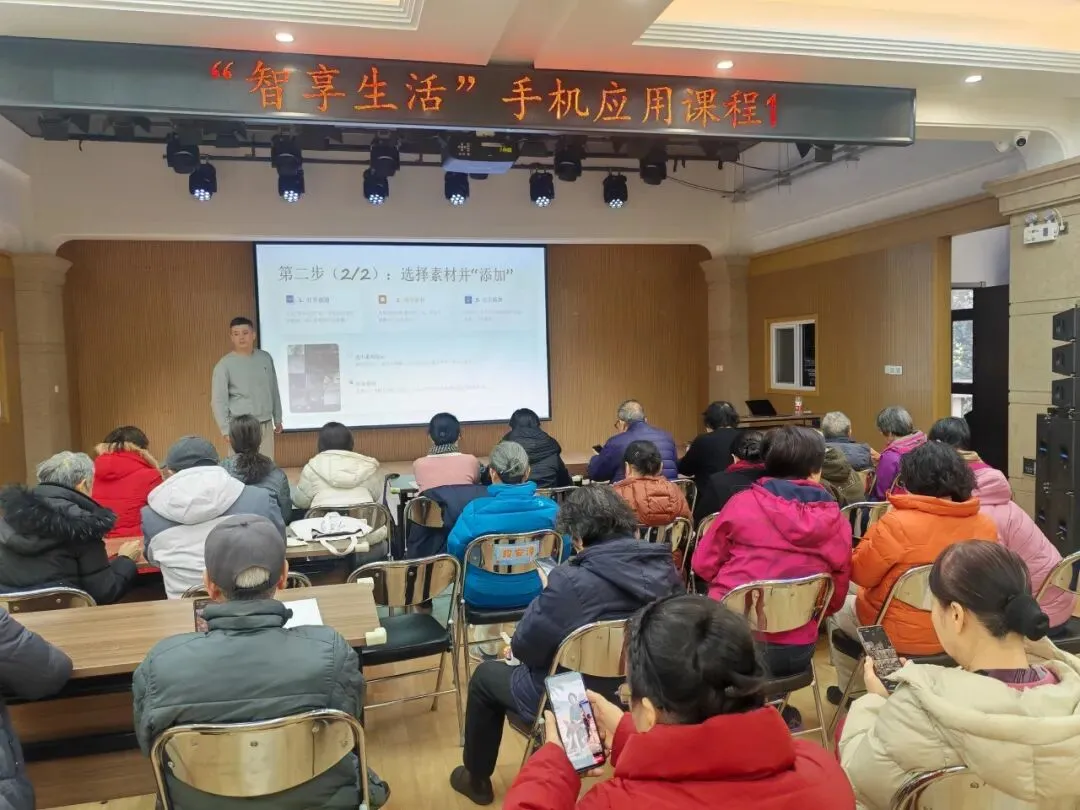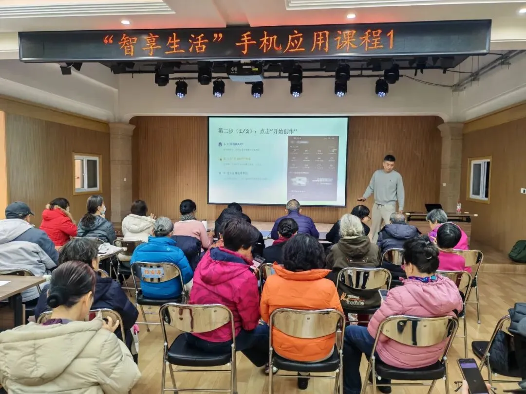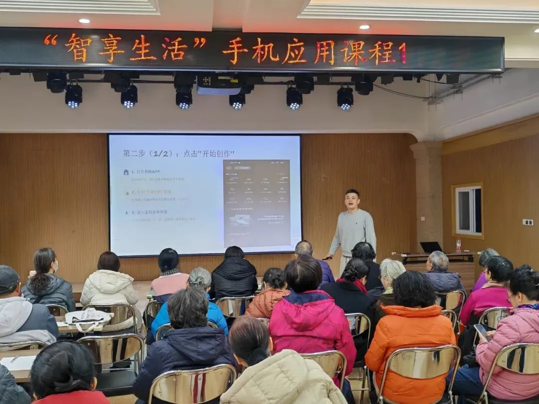 课程聚焦老年人日常需求,量身定制教学内容,今日课程为剪映实操课,通过短视屏制作技巧,拓宽社交分享与创作渠道。老师从基础界面讲解入手,逐步演示视屏剪裁、专场特效、字幕添加、背景音乐搭配等关键功能。针对老年学员操作慢的特点,课程采用“分步练习与一对一指导”的模式,重点讲解如何利用“一键成片”模板快速制作生活短视频,现场可完成剪辑作品。有的居民兴奋地展示自己制作的短片:“哦,原来发抖音就这么简单,以后旅游的视频自己也能加工了,太好了!”