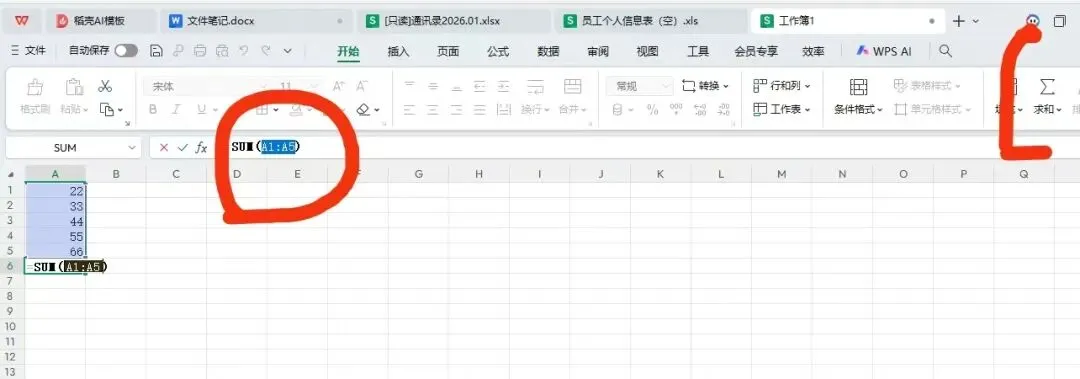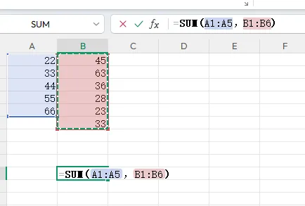 2、多区域不连续的区域求和,每个区域中间加个,号即可。如下:=sum(A1:A5,B1:B6)。