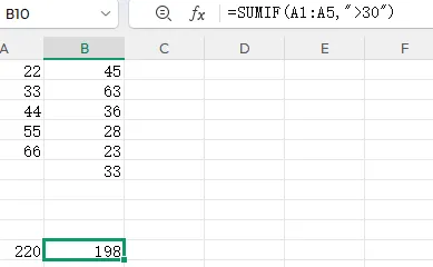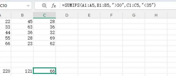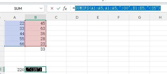 再例如:求B1~B5大于30且对应的C1~C5小于35的,对应的A列求和。如下:=SUMIFS(A1:A5,B1:B5,”>30″,C1:C5,”<35″)