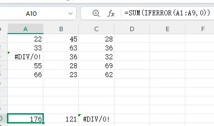 5、忽略错误值求和。如果想忽略数据中的错误值可以在其中镶套IFERROR函数,如下:=SUM(IFERROR(A1:A9,0))
