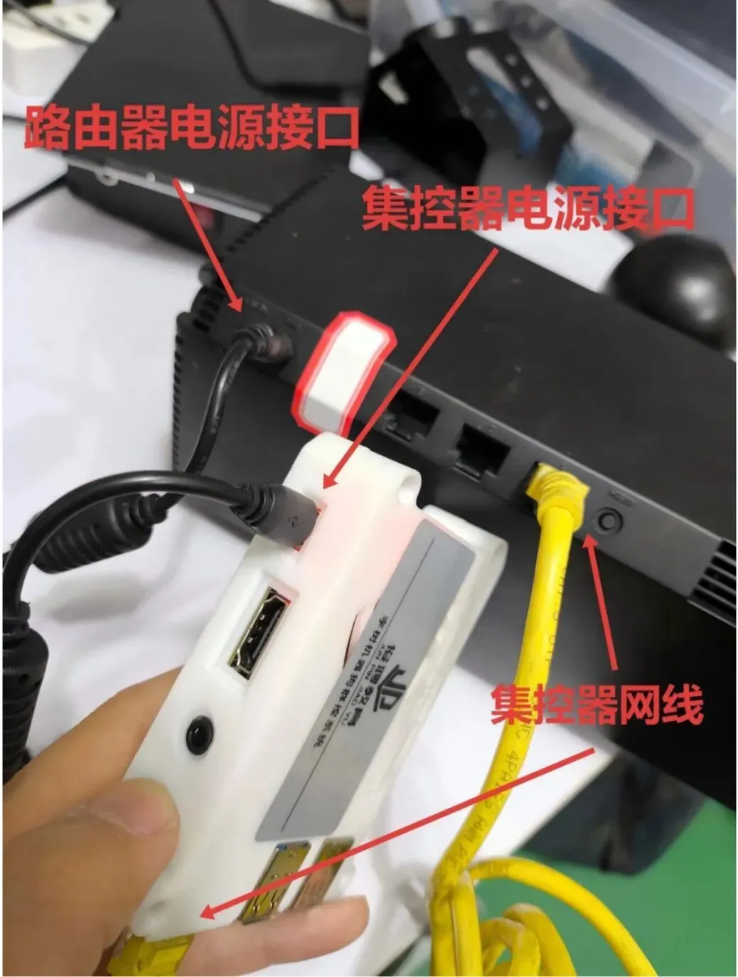 1、整套设备包含一个路由器,一个集控器。按照如图所示连接各个接口及电源。